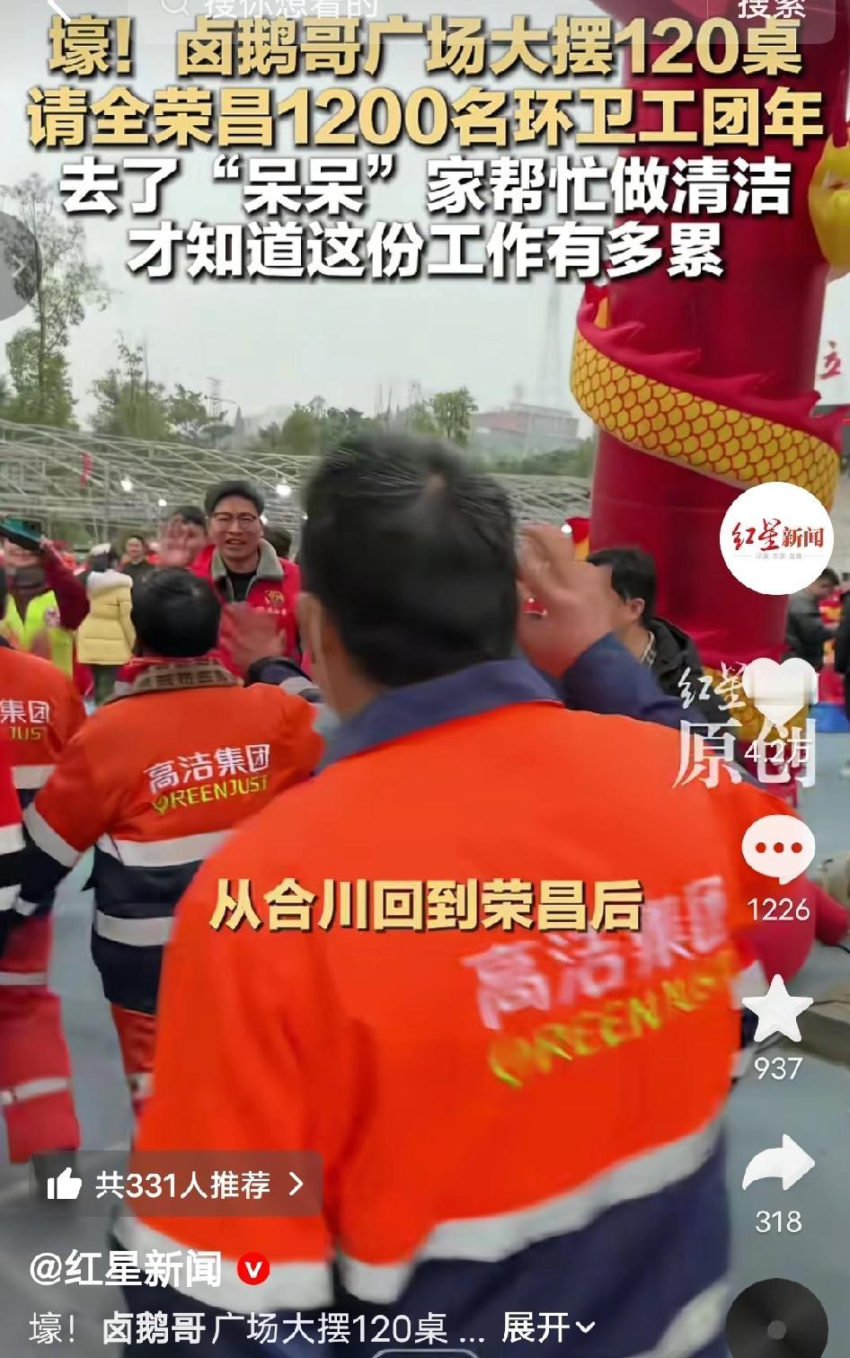 格局拉满!重庆荣昌“卤鹅哥”豪摆120桌宴请全区1200名环卫工吃团年饭,背后原因太暖心 2026年1月19日,荣昌马拉松广场热闹非凡,120张铺着红桌布的圆桌整齐排开,1200名身着蓝黄相间环卫服的工人围坐在一起,吃着热菜、看着舞龙舞狮,脸上笑开了花。这场暖心团年宴的发起者,正是被网友称为“卤鹅哥”的林江。 就在一周前,卤鹅哥去合川参加“呆呆杀猪宴”,活动结束后现场留下了几十袋垃圾,他和环卫工一起清理到凌晨两点,累得腰都直不起来。那一刻他真切体会到:“环卫工每天都在做这样的事,太辛苦了。” 回到荣昌后,他立刻决定要请全区的环卫工吃一顿团年饭。为了这场宴席,他提前一周就开始筹备,请来7-8名厨师、近百名帮工,不仅准备了卤鹅、羊肉汤等硬菜,还为每位环卫工人准备了保暖围巾和新春礼包。 席间,他端着酒杯一桌桌敬酒,握着环卫工的手说:“你们起得最早、睡得最晚,荣昌的干净整洁都是你们用双手换来的,这顿饭,必须我请!”说到动情处,他忍不住红了眼眶。 - “卤鹅哥是真性情,不是作秀,是真的懂感恩!” - “这才是网红该有的样子,用实际行动传递温暖!” - “一顿饭暖了1200个人的心,荣昌因为有你更美丽!” - “希望多一些这样的正能量网红,比那些只会炒作的强多了!” 一次体验,一场宴席,一份敬意。你身边有这样默默温暖他人的普通人吗? 卤鹅哥请环卫工吃团年饭 暖心民生 重庆正能量 荣昌卤鹅哥 致敬环卫工人 来源:红星新闻及网络公开内容,如有侵权请联系即删 配图说明:本文配图/视频素材来自抖音@红星新闻,仅用于内容分享,侵权联删