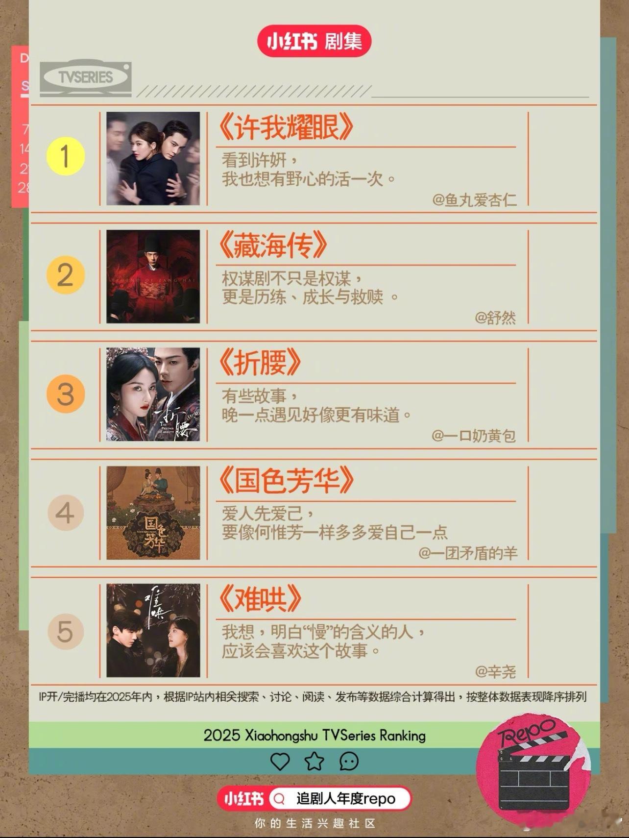 小红薯年度热门剧集TOP10《许我耀眼》《藏海传》《折腰》《国色芳华》《难哄》《白月梵星》《雁回时》《临江仙》《书卷一梦》《生万物》