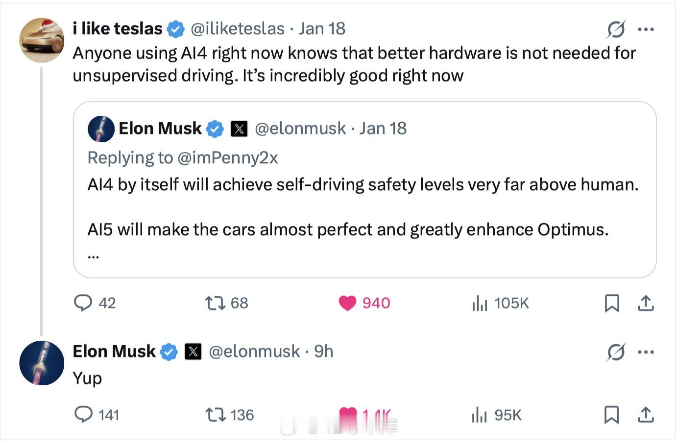 马斯克已经确认,AI4(HW4)版特斯拉将实现 FSD(无监督),无需额外的硬件。大家觉得这个承诺啥时候能兑现?42how新能源汽车特斯拉