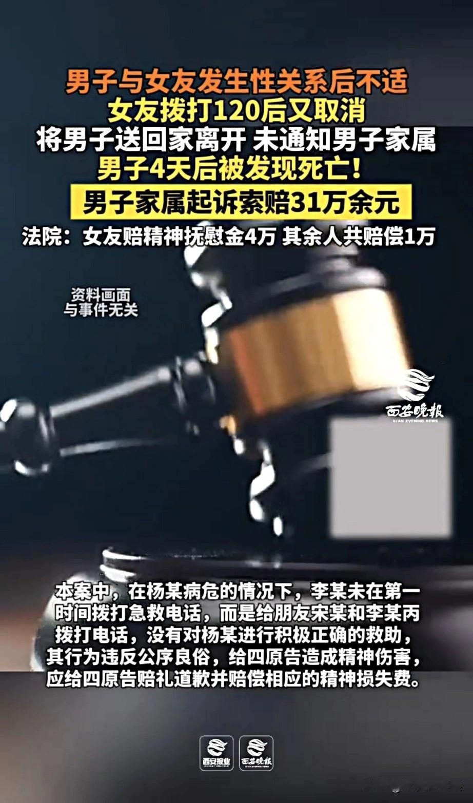 “紧急提醒!情侣、朋友之间都要看!” 有个叫杨某的大叔,老伴走得早,自己一个人过,后来认识了个女的叫李某,俩人处上对象了,本来寻思晚年有个伴儿,挺好的事儿,谁能想到最后出这么大岔子! 事发那天啊,杨大叔特意去李某家串门,俩人处对象嘛,难免亲近亲近,结果亲密完了之后,杨大叔突然就不对劲了——浑身不得劲,没一会儿直接晕过去了,意识都不清醒了,瘫那儿不动弹! 换作咱正常人,看到这情况不得魂都吓飞了?第一反应肯定是赶紧打120啊!可李某倒好,脑子不知道咋想的,不打急救电话,先给自己朋友宋某他们几个打电话,让他们过来“帮忙”。 等宋某那几个人到了,一看杨大叔都昏迷了,赶紧提醒李某:“我的妈呀,这都啥时候了!赶紧打120啊,别耽误了!”李某这才不情不愿地拨了120,结果你猜咋着?挂了电话没几分钟,她不知道哪根筋搭错了,又给120回拨过去,说“病人没事儿了,不用来了”! 接下来的操作更离谱!李某、宋某他们五个人,一起把昏迷不醒的杨大叔抬上车,送回他自己家,几个人扭头就全走了!全程没一个人想着给杨大叔家里人打个电话——人家杨大叔有四个儿女呢!哪怕随便打一个,说句“你爸身体不舒服,在家躺着呢,你们过来看看”,也不至于出后面的事儿啊! 就这么着,杨大叔一个人在空荡荡的家里躺了整整四天!第四天的时候,他儿子寻思好几天没见着爸了,回家看看,一推开门,当场就傻眼了——他爸早就没气儿了,身体都凉透了!你说这打击多大啊?四个儿女哭得肝肠寸断,又心疼又生气,直接把李某、宋某他们五个人告到法院了,要求赔偿31万多,还得公开给他们赔礼道歉! 法院最后判的也挺明白:家属拿不出直接证据,证明杨大叔的死就是这五个人直接造成的,所以31万的大额赔偿没支持。但法官也说了,李某作为杨大叔的女朋友,看到人都昏迷了,不第一时间找急救,还瞎取消120,送回家就不管了,连家属都不通知,这也太不讲良心了,完全违背了做人的道理,把家属的心都伤透了;宋某他们几个跟着瞎掺和,一起这么处置,也有责任! 最后判决下来:李某赔4万块钱精神损失费,宋某他们另外4个人凑一起赔1万,而且这五个人,都得给杨大叔的家属写书面道歉信! 说实话啊,我看完这事儿,气的都想骂街!杨大叔本来就是突发不适,要是李某第一时间打120,要是他们没瞎取消急救,要是有人想着通知下家属,这条命指定能保住啊!可就因为他们的侥幸心理,觉得“可能没啥事儿”,再加上那点冷漠,把该尽的道德义务全抛到脑后了,最后不仅让一个好好的家庭碎了,自己也得赔钱道歉,这辈子心里能踏实吗? 这事真的教训太大了,生命就一次,别心存侥幸,也别漠视身边人的安危。转发给身边的朋友,尤其是处对象、同居的,让大家都记牢:关键时刻,别让“冷漠”酿成一辈子的遗憾!