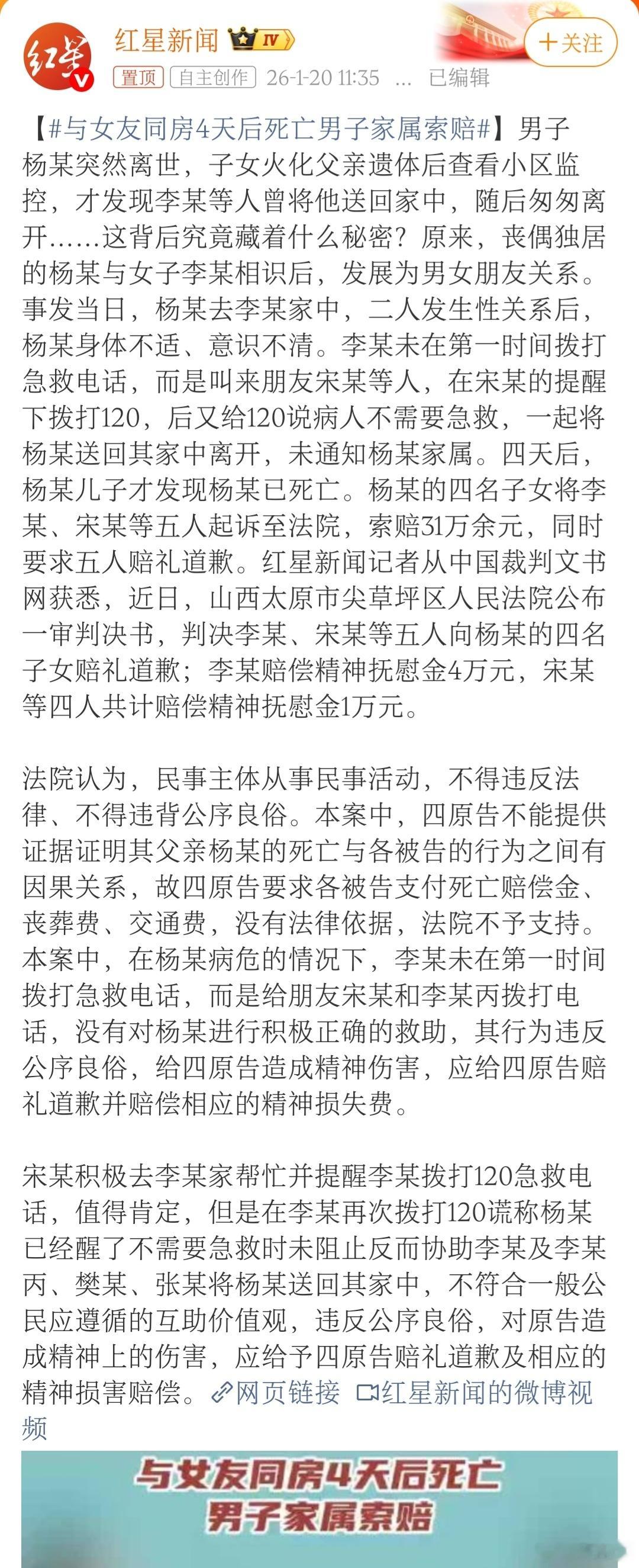 与女友同房4天后死亡男子家属索赔 这案子,不构成过失致人死亡罪吗?根据媒体报道,男子在与女友同房后突发身体不适,意识不清。但其女友却未在第一时间拨打急救电话。后来虽在朋友提醒下拨打120,但在电话接通后,又向120表示病人无需急救,只是把病人送回家,而未通知家属。我为什么认为这案子涉嫌过失致人死亡罪?因为,我之前看过类似案例➡️网页链接当时是女方在与男方发生关系时,突然发出不正常声音,眼歪嘴斜的同时,伴有小便失禁。男方不以为意,只是将对方的排泄物擦拭干净,便睡觉去了。等到第二天发现情况不对,终于想起送医抢救,但已为时已晚。这个案子,一审是以故意杀人罪判了3年,二审改判为过失致人死亡罪,判了2年。具体到两案上。具体情节虽有不同,但本质上相似。都是发生关系后突发意外,另外一方对此置之不理。但为什么一个仅承担民事责任,而另外一个则上升到刑事地步呢?实务案例看一看