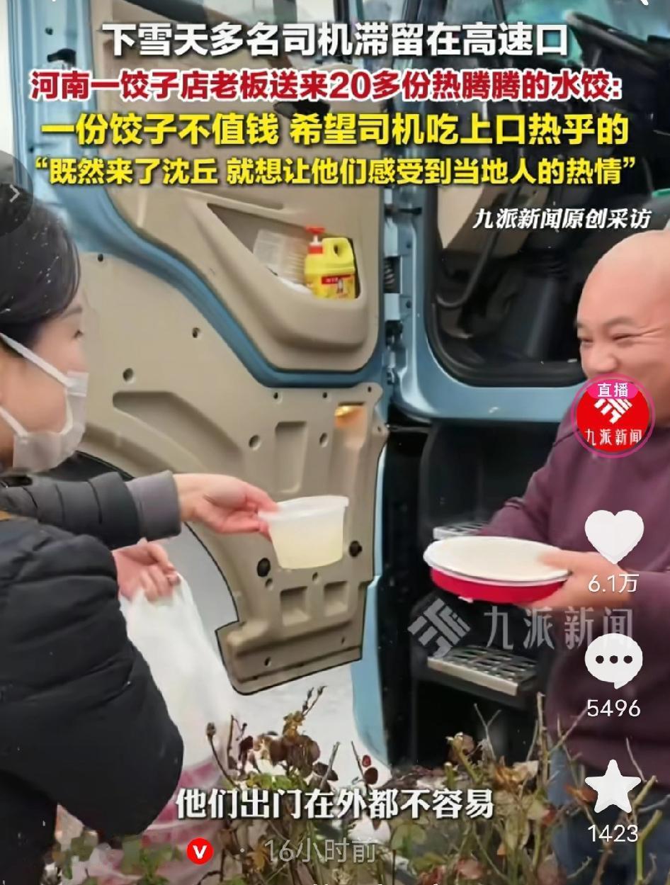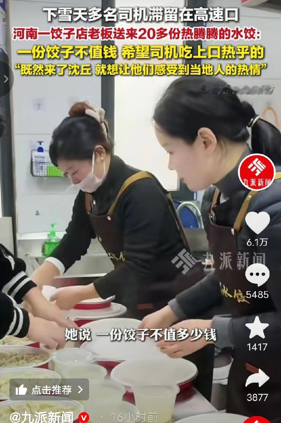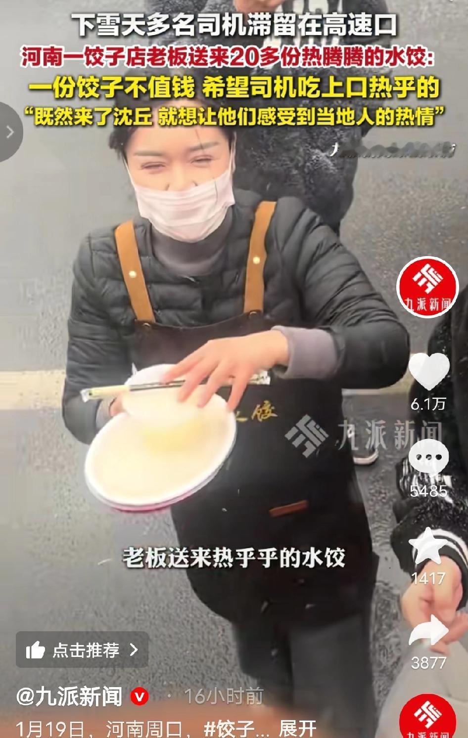 破防了!河南周口大雪封路,数十名货车司机被困高速口,饿了大半天的他们正犯愁,没想到对面饺子店的孟大姐带着员工包了20多份热饺子,裹着厚棉被、顶着风雪骑电动车送过来:“既然来了沈丘,就让你们尝尝本地人的热情!” 2026年1月19日,河南周口沈丘县迎来新年首场暴雪,鹅毛大雪下了整整一上午,高速路因路面结冰紧急封闭,数十辆货车被迫滞留在高速口的辅道上。积雪没过脚踝,寒风卷着雪花拍在车窗上,瞬间凝出一层白霜,不少司机已经饿了大半天,周边商铺因大雪歇业,想找口热饭吃都成了难事,有人只能缩在驾驶室里,就着矿泉水啃冷面包。 住在高速口对面的饺子店老板孟女士,刷朋友圈看到司机滞留的消息,心里一下子揪紧了。她二话不说喊上店里的员工,把案板搬到店门口,撸起袖子就开始忙活:和面、擀皮、调馅一气呵成,韭菜鸡蛋、猪肉大葱、茴香馅,全是普通人爱吃的家常口味,案板上的饺子很快码得整整齐齐,圆滚滚的挤在一起。 水烧开,饺子下锅,翻滚的沸水裹着饺子浮起,飘出阵阵鲜香。孟女士把煮好的饺子挨个装进餐盒,浇上热腾腾的汤汁,又搬来两个厚棉被,把餐盒一层一层裹进保温箱,生怕路上凉了。她裹紧厚棉袄、系好围巾,把保温箱绑在电动车后座,顶着漫天风雪往高速口骑,电动车碾过积雪,发出“咯吱咯吱”的声响,雪花打在脸上生疼,她却只顾着扶稳后座的保温箱。 到了高速口,孟女士一户户敲开车门,把热乎的饺子递到司机手里,笑着说:“快吃吧,热乎的!一份饺子不值多少钱,就想让你们在雪天吃上口热饭。” 司机们一开始还客气地问多少钱,得知是免费赠送后,一个个都红了眼眶,有人接过餐盒时,手指冻得通红还在微微颤抖。一位跑山东的老司机,扒开餐盒尝了第一口,声音都带着哽咽:“跑了十几年运输,走南闯北,第一次在大雪天遇到这么暖心的事,河南人真中!牛” 忙前忙后送完20多份饺子,孟女士的头发和肩膀都落满了雪花,脸颊冻得通红,却依旧笑着和司机们道别:“要是不够吃,我再回去包!”她坦言:“咱也是普通人,知道跑长途的不容易,风里来雨里去的,挣的都是辛苦钱。既然来了沈丘,就是咱的客人,就想让他们感受到本地人的热情。” 网友纷纷留言 - “这才是真正的人间烟火气,雪天里的一碗热饺子,暖了胃更暖了心。” - “河南大姐太实在了,裹棉被送饺子的细节,看一次感动一次!” - “一份饺子不值钱,但这份善意重千斤,让冬天不再寒冷。” - “以后路过沈丘,一定要去大姐的店里吃一碗热腾腾的饺子,支持善良的人!” 一碗热饺子,一份陌生人的善意,融化了冰雪,温暖了整个冬天。你遇到过这样雪中送炭的温暖瞬间吗? 河南大姐雪天送饺子 暖心民生 沈丘正能量 风雪中的温暖 河南人真中 来源:九派及网络公开内容,如有侵权请联系即删 配图说明:本文配图/视频素材来自抖音@九派新闻,仅用于内容分享,侵权联删