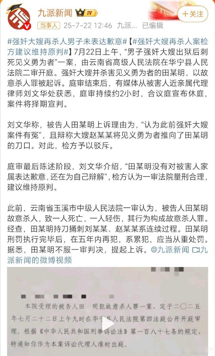 亲弟弟强奸追杀妻子丈夫发声 这个案子,就是鼎鼎有名的“男子强奸大嫂出狱后刺死见义勇为者”案。虽然当事人表示,她对此前的死缓判决并不满意,希望再审能判处男子死刑。但我却对案件持悲观态度。综合此前报道,该案的一二审均维持死缓判决,且二审判决就是由云南省高院做出的。另据此前报道,检察院这边也认为一审量刑合理。哪怕我也希望再审能够宣判死刑,但很显然,现今的情况相当不乐观。女子遭强奸被杀2次望判凶手死刑