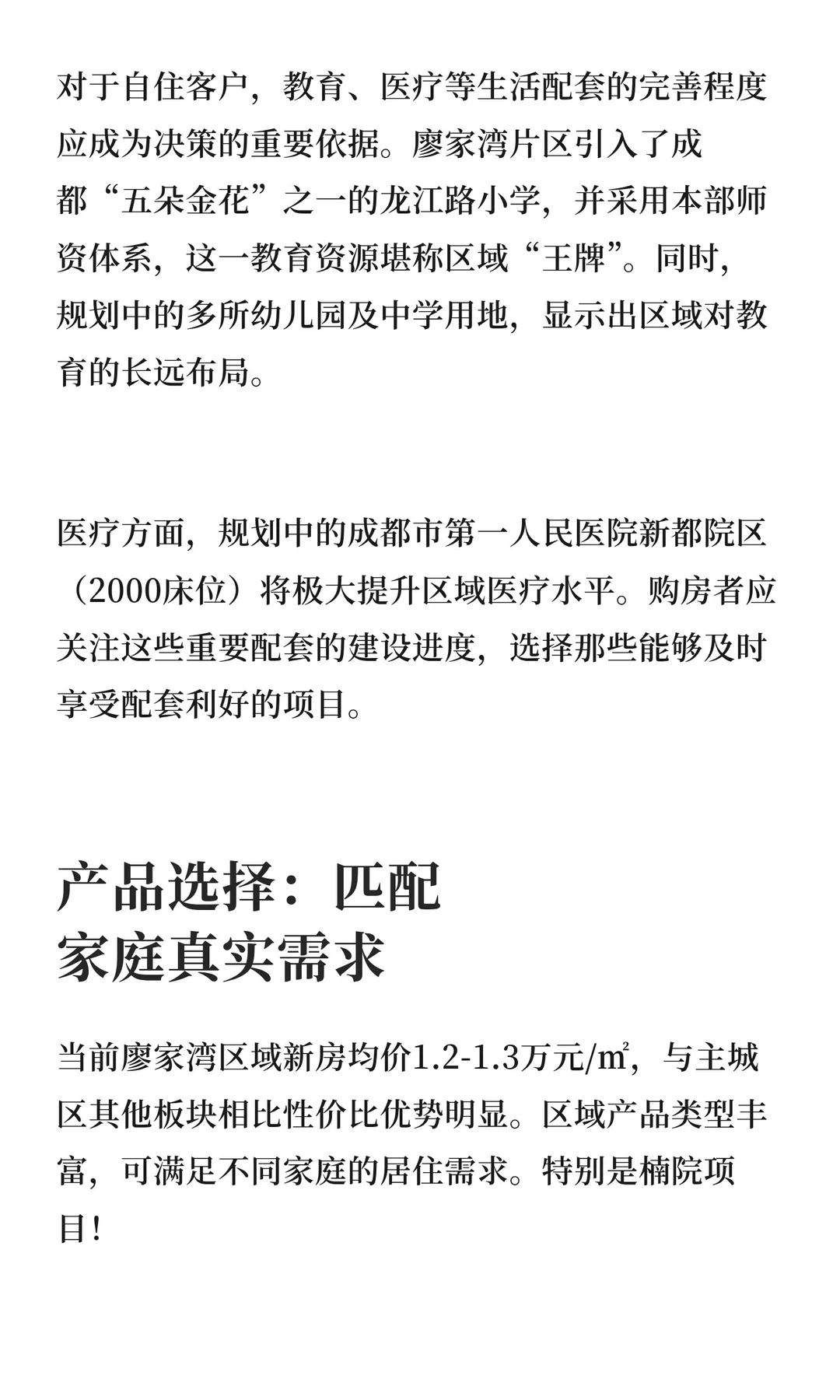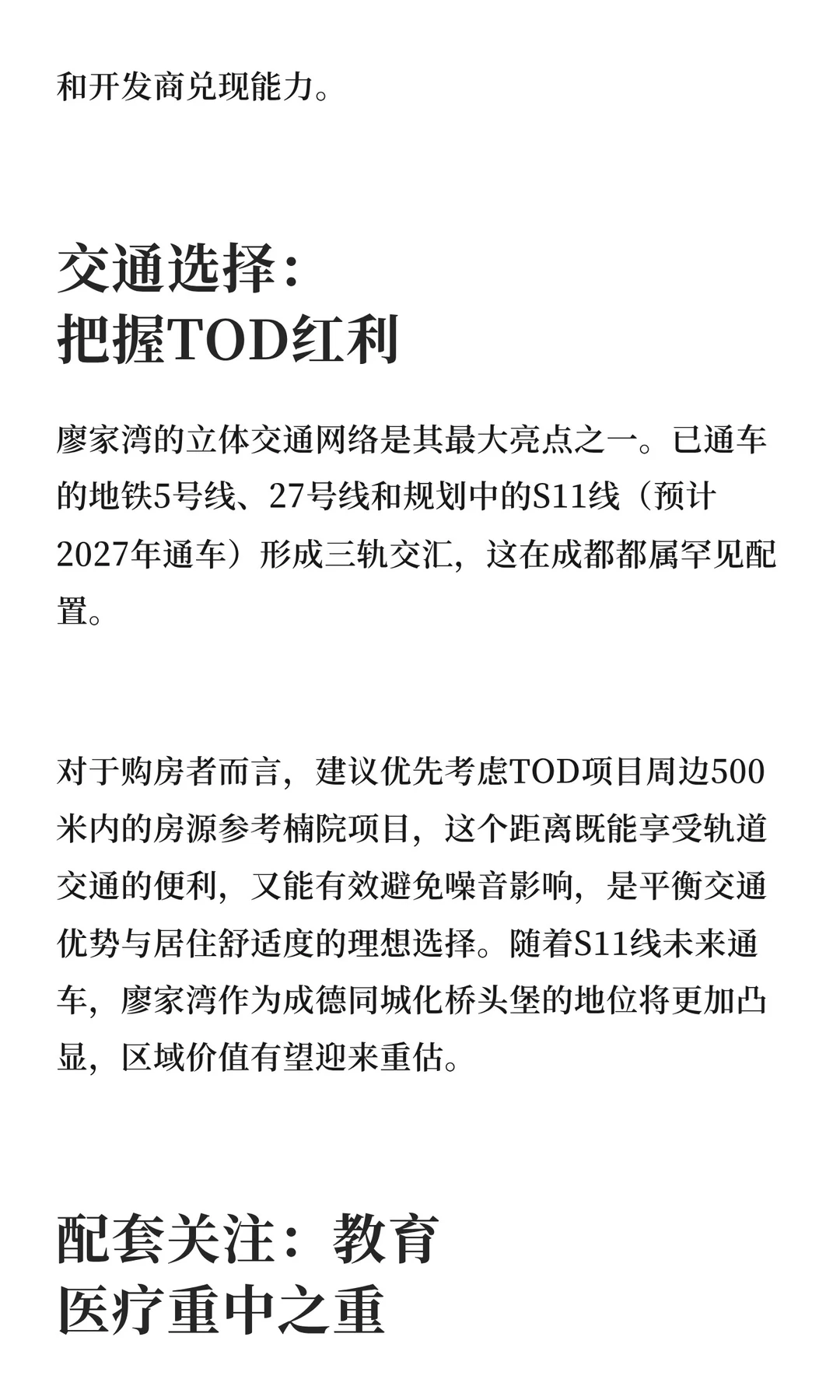 廖家湾作为成德同城化桥头堡,凭借“三轨交汇+城北医疗高地+未来公园社区”规划,发展潜力强劲。购房者应关注交通、教育、医疗配套,选择TOD项目周边房源,把握价值兑现期。