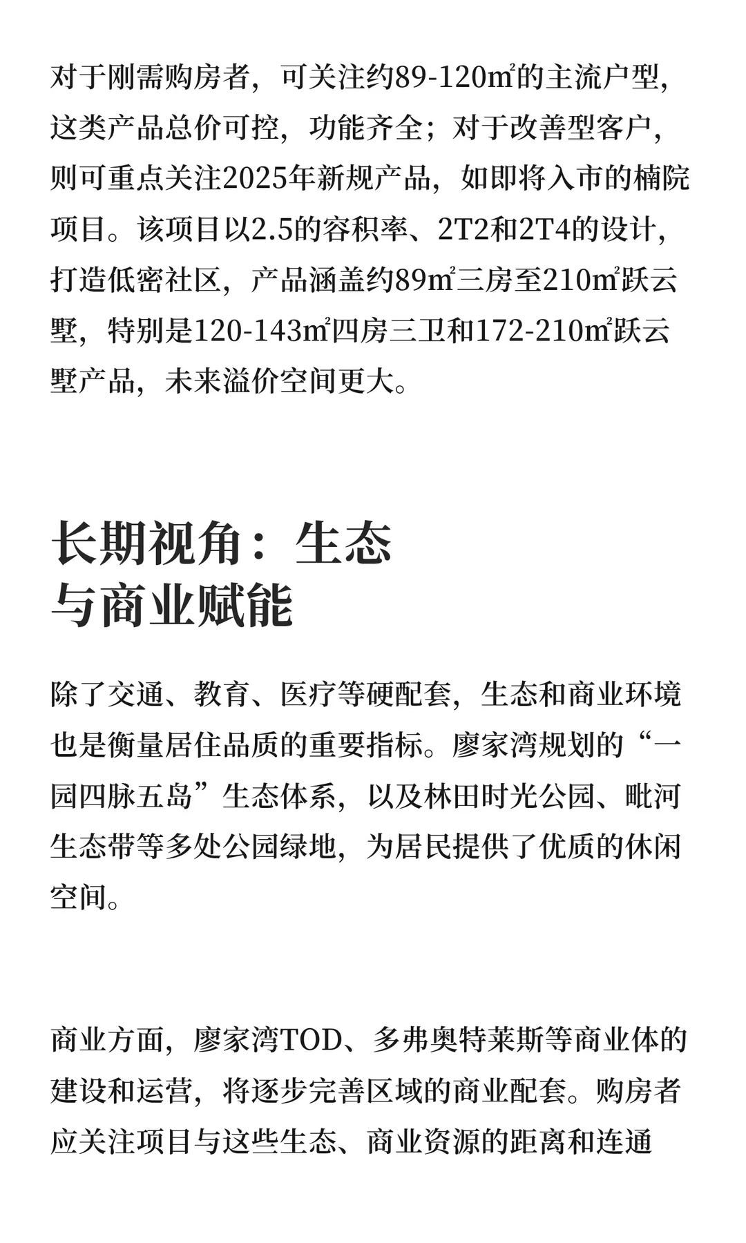 对于刚需购房者,可关注约89-120㎡的主流户型,这类产品总价可控,功能齐全;对于改善型客户,则可重点关注2025年新规产品,如即将入市的楠院项目。该项目以2.5的容积率、2T2和2T4的设计,打造低密社区,产品涵盖约89㎡三房至210㎡跃云墅,特别是120-143㎡四房三卫和172-210㎡跃云墅产品,未来溢价空间更大。