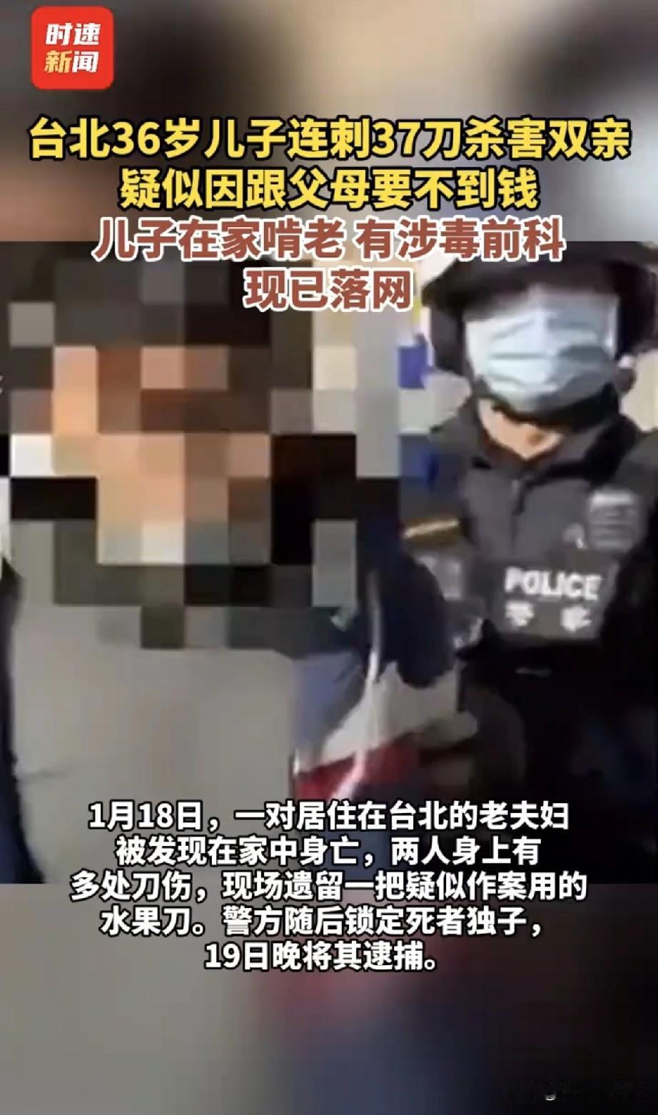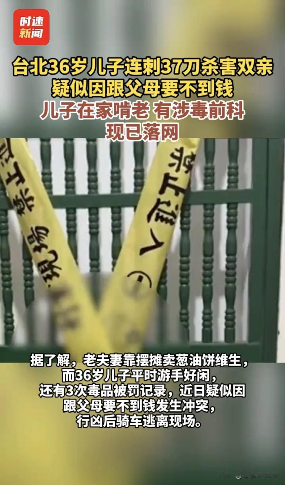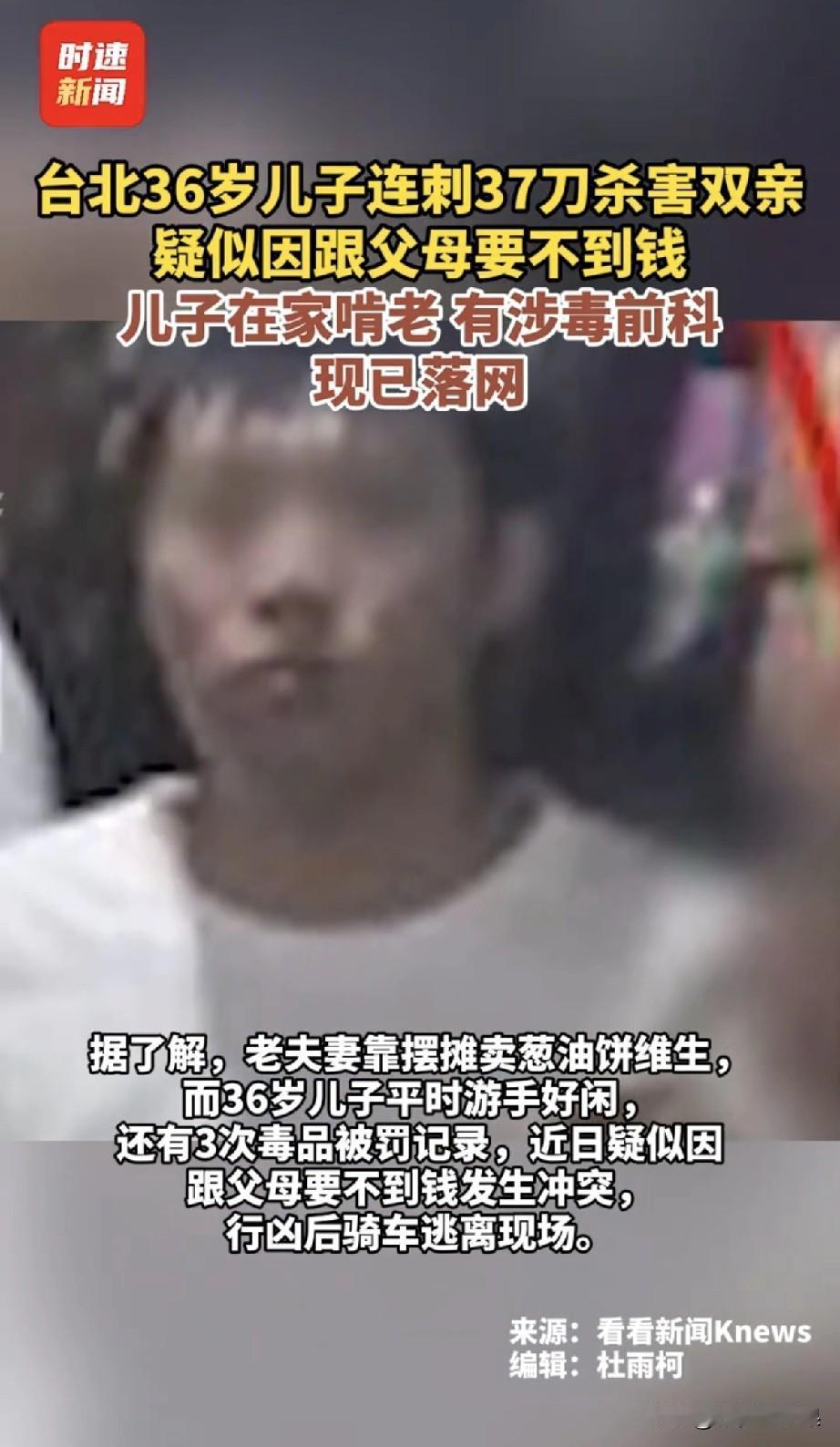 37刀弑亲血案:每月5000块养出杀父母恶魔,惯子如杀子真不是吓唬人! 台湾新北市芦州区那起惨案,你们都听说了吧?36岁的廖某,就因为嫌爸妈给的5000块零用钱不够花,跟67岁的老爹、75岁的老妈吵了一架,竟然直接举起刀,对着亲生父母疯狂砍杀!24刀砍在父亲身上,13刀扎进母亲身体,刀刀深可见骨,两位老人的血几乎都流干了。 你们知道这5000块钱是咋来的吗?是老两口在寒风里摆摊卖葱油饼,一张一张烙出来的血汗钱啊!自己舍不得吃舍不得穿,把挣来的钱全塞给儿子,结果养出了个白眼狼,养出了个索命的恶魔! 更让人脊背发凉的是,这廖某根本就是个游手好闲的啃老族,没工作没收入,早就有3次涉毒前科!爹妈不是不知道,可就是狠不下心管教,一次次纵容,一次次妥协,总觉得“他是我儿子,我不管谁管”。 我真的想说,惯子如杀子,这句老话真的不是随便念叨的!多少父母就跟廖某爹妈一样,把无底线的纵容当成爱,把没原则的满足当成疼。孩子伸手要钱,给!孩子闯了祸,替他扛!孩子沾了歪门邪道,舍不得送去管教!总觉得“孩子还小”“长大了就好了”,可你们看看,这纵容的结果是什么?是养出了一个连爹妈都敢杀的畜生啊! 36岁,早就该顶天立地的年纪,却还赖在家里啃老,花着父母的血汗钱,吸着害人的毒品。就因为钱不够花,就能对生养自己的双亲下死手,这哪里是儿子,分明是来讨债的恶鬼! 我见过太多这样的家庭了,爹妈把孩子捧在手心里,含在嘴里怕化了,捧在是长期纵容埋下的雷,迟早要炸! 毒品固然可怕,能把人变成没有人性的恶魔,但比毒品更可怕的,是父母无底线的溺爱!如果早一点断了他的零花钱,逼他出去找工作;如果早一点狠下心,把他送去强制戒毒;如果早一点教会他什么叫责任,什么叫感恩,何至于落得家破人亡的下场? 这起血案真的该给所有父母敲个警钟!爱孩子,一定要有底线,有原则!真正的爱,不是替他遮风挡雨,而是教会他自己打伞;不是满足他所有的欲望,而是让他懂得付出才有回报。 别再用你的溺爱,养出一个不懂感恩的白眼狼;别再让“惯子如杀子”的悲剧,一次次重演!