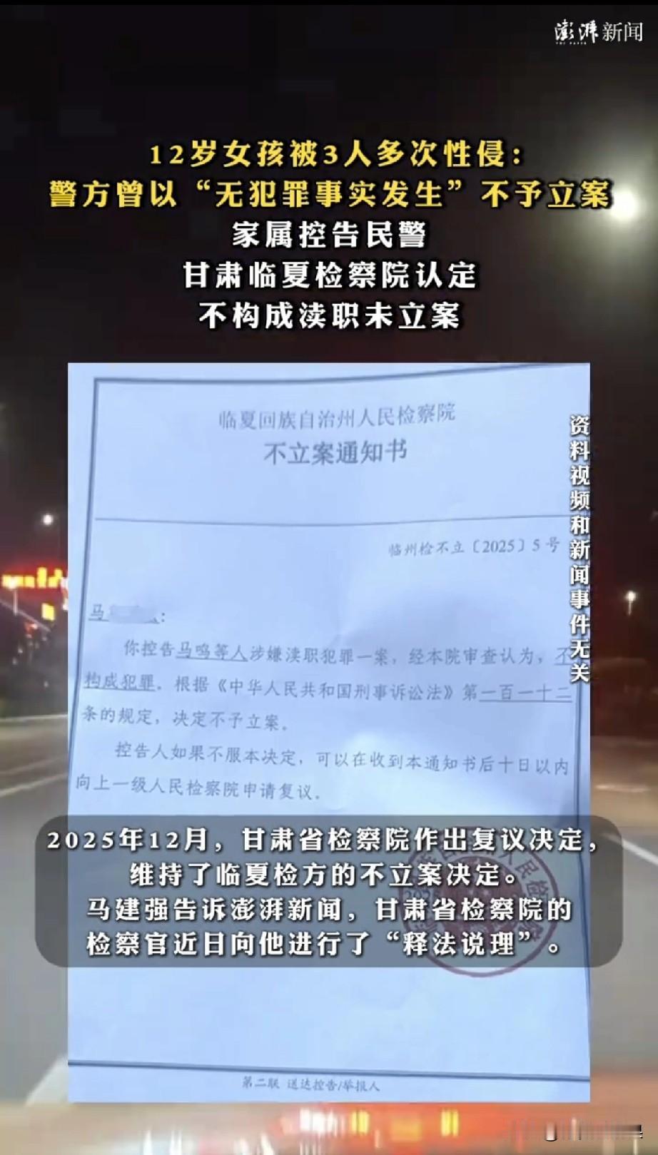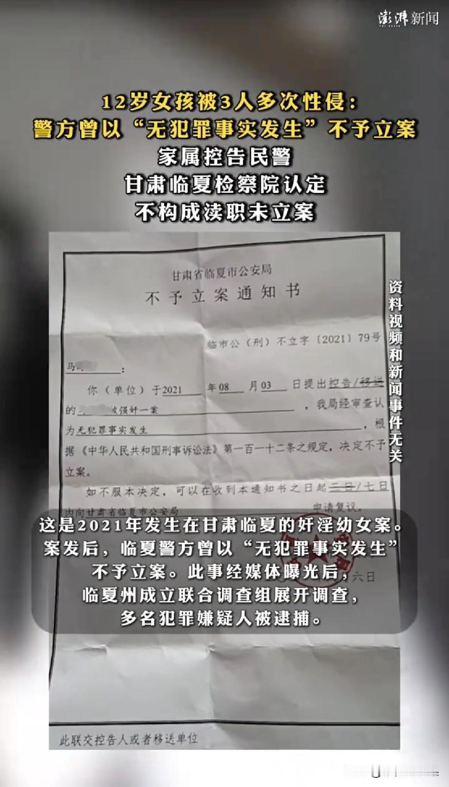 惊掉下巴!12岁女孩被性侵,居然“不给立案”?这操作把我三观震稀碎! 家人们!我真的是活久见!2021年甘肃临夏这事儿,我现在说起来都气得浑身发麻! 一个12岁的小姑娘,被网友骗去城里,结果被三个坏蛋整整折磨了三天! 孩子哭着跑回家,爹妈魂都吓没了,第一时间冲去报警,结果你猜怎么着? 帽子叔叔轻飘飘甩出来一张《不予立案通知书》,上面居然写着——无犯罪事实发生! 我当时看到这几个字,直接原地爆炸! 12岁啊!法律明文规定,和未满14周岁的幼女发生关系,不管她愿不愿意,都算强奸! 这是铁律!是红线!就这么明明白白的案子,居然能被定性为“没犯罪”? 我就想问一句:这是把法律当擦屁股纸,还是把老百姓当傻子耍? 要不是媒体把这事儿捅出来,全网炸锅,那三个坏蛋是不是就要逍遥法外了? 那小姑娘是不是就要一辈子背着“被白嫖”的污名? 直到全国网友骂到热搜第一,当地才装模作样成立调查组,把人抓了判了刑。 更离谱的还在后面! 家属控告办案警察渎职,结果检察院说“不构成犯罪”! 检察院给出的理由是:办案警察虽然没查清关键证据、没恢复手机内容、没核实口供矛盾,但这些“小问题”还没到“渎职”的程度,所以不用担责! 我就想问: 12岁女孩被性侵,法律白纸黑字写着不满12周岁直接认定“明知”是强奸,这都能办错案,到底是能力问题还是态度问题? 把关键线索全漏掉,差点让罪犯逍遥法外,这叫“没到追责程度”? 更讽刺的是,受害者家属维权四年,连被问责的12个公职人员名单都拿不到! 合着犯错的人隐身,只有受害者全家在扛下所有? 这已经不是一个案子的问题了,这是在告诉所有人: 普通人遇到不公,就算媒体曝光、全网声讨,最后也可能是“雷声大雨点小”。 我就想问问:到底要错到什么程度,才算“渎职”?