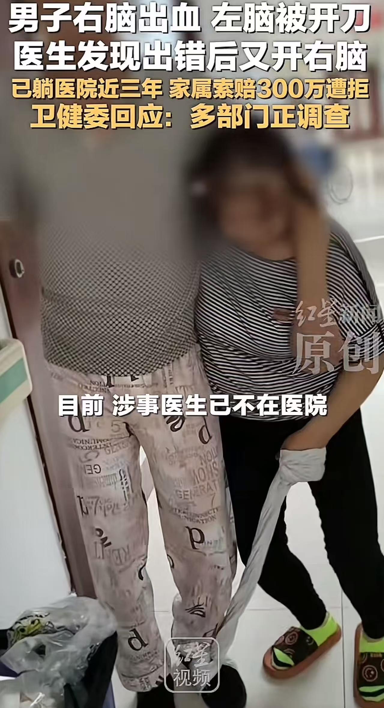 男子右脑出血被开左脑,医生发现出错又开右脑,家属提出赔300万被拒!妻子:“我老公已经在医院躺了3年,左侧基本瘫痪,我一个家就还有被他们毁掉了!”网友:左右不分,离了个大谱!这种明显严重的过错、毁掉一个人的一生、主刀医生应该判刑…… 2023年1月31日清晨,45岁的王先生像往常一样准备出门跑车,却在卫生间突然晕倒,一头栽在地上。妻子潘女士吓得魂飞魄散,立刻拨打了120。 救护车呼啸着将他送进当地一家医院。CT检查显示:右侧大脑基底节区出血,情况危急,必须立即开颅手术清除血肿! 潘女士手抖得几乎握不住笔,在手术同意书上签下名字。她万万没想到,这一签,竟签下了丈夫三年的噩梦。 手术进行了数小时。当王先生被推出手术室时,家属发现他左侧头部赫然鼓起一个大包,人已陷入深度昏迷,直接转入ICU。 更诡异的是,术后第七天,医生又紧急通知:“左脑也出血了,需要二次手术!” 潘女士彻底懵了——明明是右脑出血,怎么左脑也出问题了? 她强忍悲痛,带着原始CT片去别的医院求证。一位专家看完片子后震惊地说:“第一次手术……开错了边!他们把健康的左脑切开了!” 这个消息如晴天霹雳。潘女士当场瘫坐在地——原来丈夫的“左脑出血”,是医生误切健康脑组织后引发的继发性损伤! 面对铁证,涉事医院最终承认:主刀医生失误,对左脑进行了开颅。发现问题后,才仓促补救,打开真正的出血部位——右脑。 如今,王先生已在病床上躺了整整三年。左侧身体基本瘫痪,无法说话,生活完全不能自理。曾经是家中顶梁柱的他,如今连翻身都需要人帮忙。 更令人心寒的是,医院此前每月支付18600元护工费,勉强维持治疗。可今年1月,这笔费用突然停了,只派了个护工“象征性照顾”,再不提后续赔偿。 潘女士哭诉:“我老公的人生被毁了,我的家也被毁了!我们提出300万赔偿,不是狮子大开口,是想让他有尊严地活下去……可他们连一句正式道歉都没有!” 而那名主刀医生,早已悄然离职,当地卫健委回应称,多部门已介入调查。 此事曝光后,全网震怒: “我输个验证码都要反复确认三遍,医生动刀前连左右都不看清?这是拿人命当儿戏!” “这不是医疗事故,是刑事过失!左右脑都分不清,还敢主刀开颅?资格证是怎么考的?” “一个家庭的天塌了,而肇事者拍拍屁股走人——这就是‘白衣天使’?” “现代手术有严格核查流程,术前必须三方核对患者信息、手术部位。如果这都没执行,说明整个手术团队都在渎职!” 我认为,这不是“手滑”,而是系统性失守;这不是“失误”,而是对生命最赤裸的轻慢。 当一个医生连“左”和“右”都能搞错,暴露的绝非个人粗心,而是整个医疗安全链条的崩坏——术前无核查、术中无监督、术后无追责。而受害者,却要用一生去偿还这场“低级错误”的代价。 更可怕的是,这样的悲剧并非孤例。从“纱布留腹”到“腿锯错侧”,从“婴儿抱错”到“器官误摘”……每一次“离谱”背后,都是制度漏洞与责任逃避的合谋。 法律若只让医院赔钱了事,而不追究直接责任人的刑事责任,就是在纵容“用别人的生命试错”。 请记住:手术刀下,不是零件,是活生生的人;医生肩上,不是职称,是沉甸甸的性命。别再用“医疗风险”掩盖人为之恶。