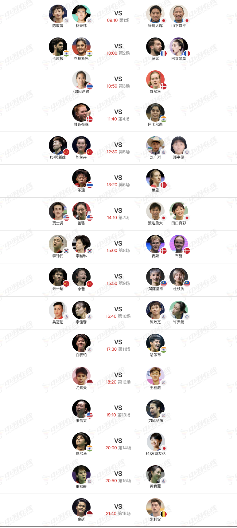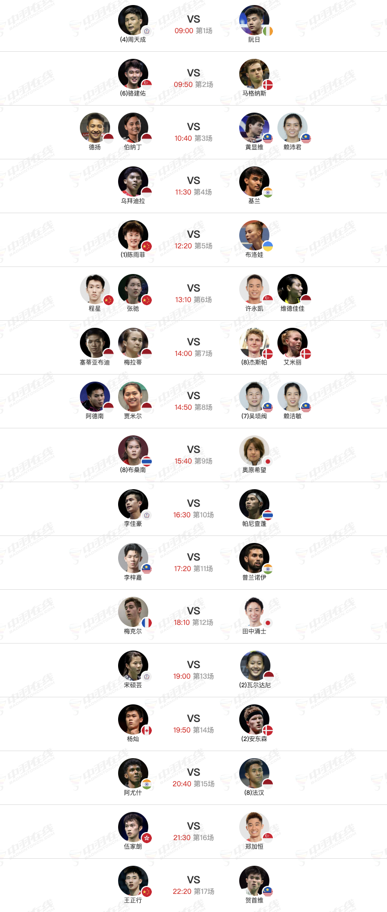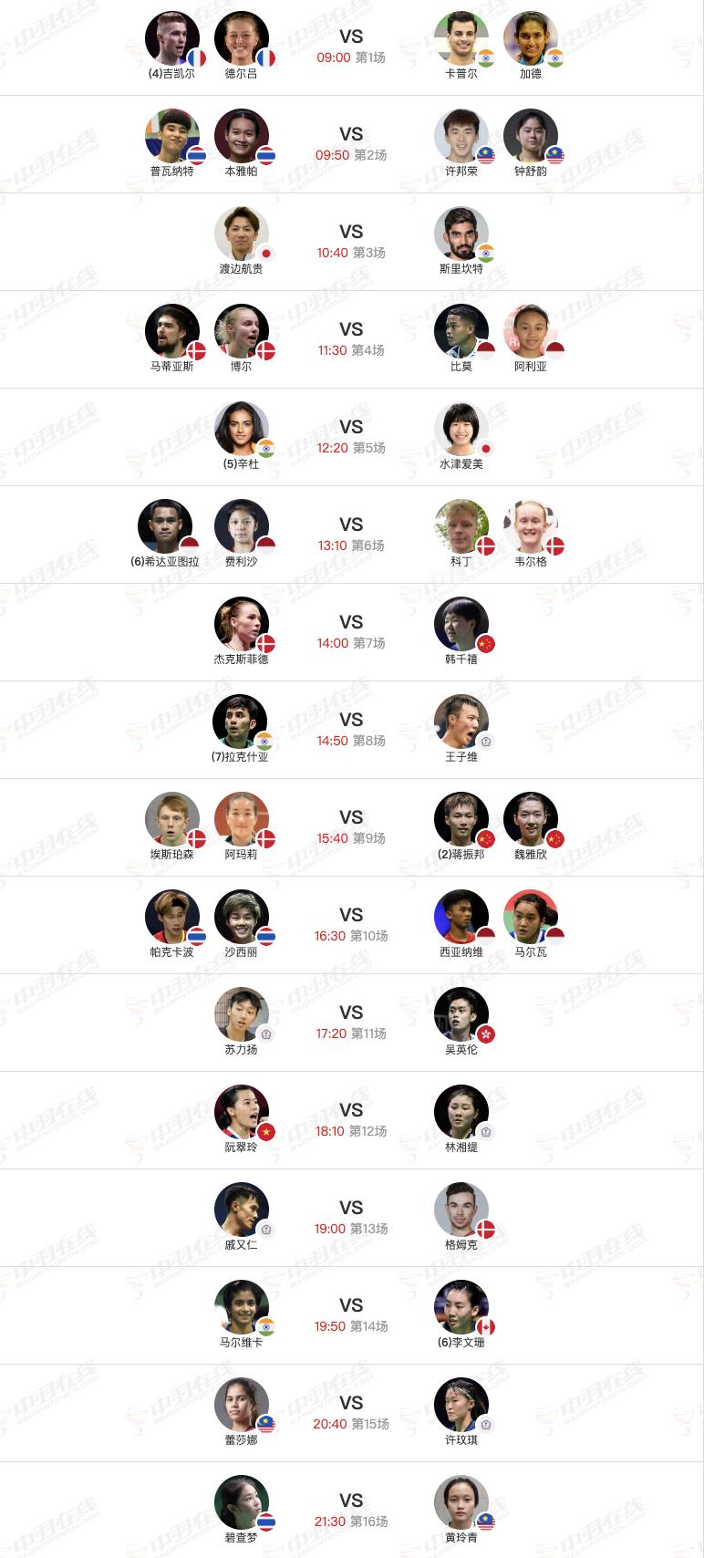 2026年印尼羽毛球大师赛 1月21日各单项32进16赛程,早上9点开赛:【1号场地】5 、陈雨菲🇨🇳 vs 🇺🇦布洛娃(1-0)6 、程星/张驰🇨🇳 vs 🇸🇬许永凯/🇮🇩维德佳佳17 、王正行🇨🇳 vs 🇲🇾贺首维(0-1)【2号场地】7 、韩千禧🇨🇳 vs 🇩🇰杰克斯菲德9、蒋振邦/魏雅欣🇨🇳 vs 🇩🇰埃斯珀森/阿玛莉【3号场地】5 、郭新娃/陈芳卉🇨🇳 vs 刘广珩/郑宇倢9 、朱一珺/李茜🇨🇳 vs 🇲🇾陈堂杰/杜颐沩