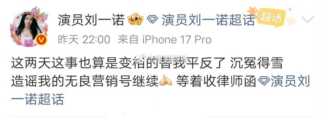 刘一诺为白珊珊造谣吴磊事件发声刘一诺又发博称吴磊起诉白珊珊一事算是帮她变相平反,因为檀健次没有像吴磊一样起诉她吗?白珊珊和刘一诺确实不一样,一个胡言乱语什么证据都拿不出来,但另一个明显手里是有证据的,所以檀健次对待她的态度也不强硬。
