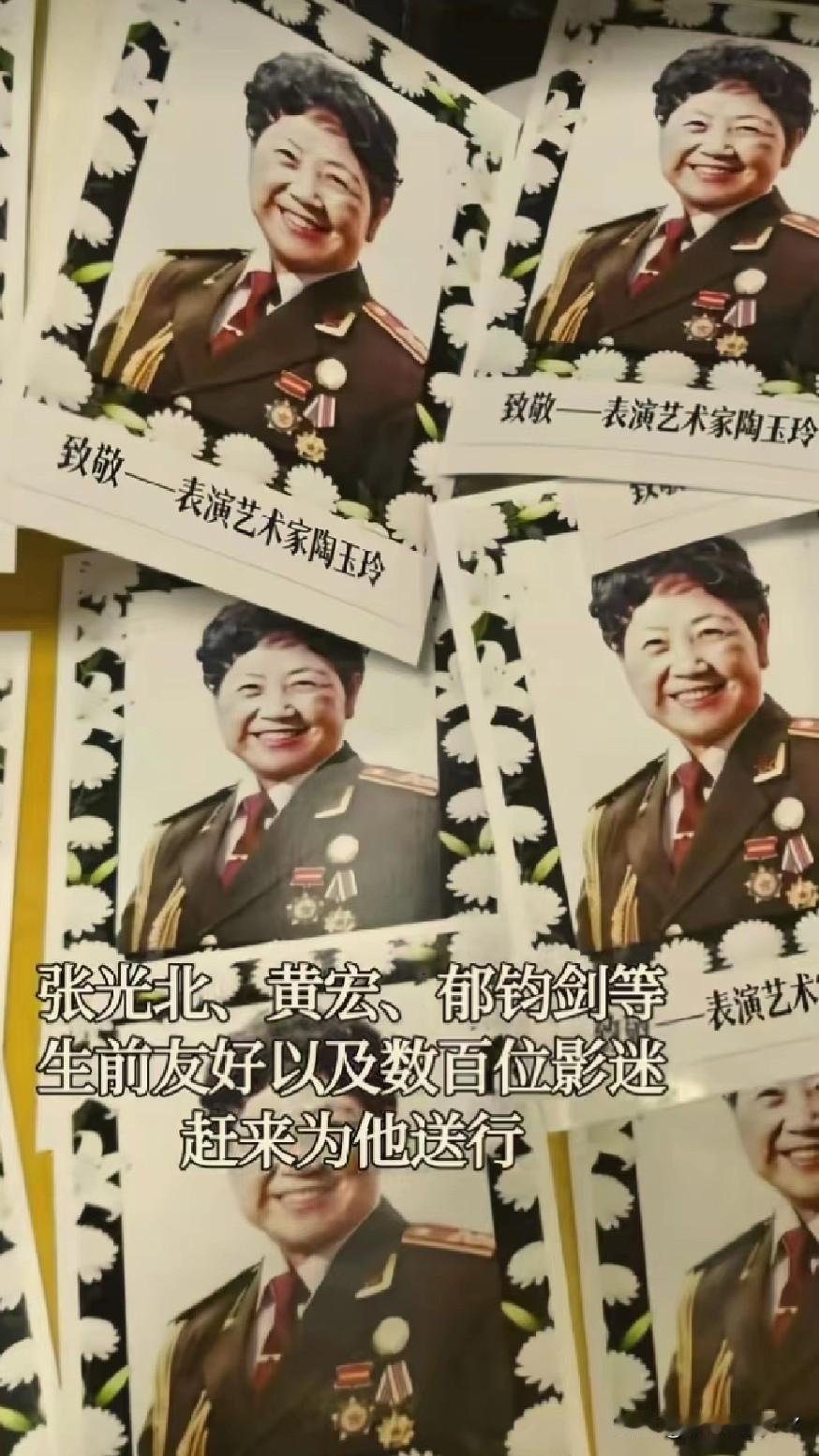 陶玉玲追悼会:92岁艺术家走完最后一程,数十位明星含泪惜别“二妹子” 1月19日上午,著名表演艺术家陶玉玲遗体告别仪式在北京八宝山殡仪馆东礼堂举行。 她的遗体上覆盖着鲜红的党旗,现场循环播放着《柳堡的故事》经典片段,挽联“守护人民哨兵永在;扎根沃土柳堡长青“,道尽她精彩的艺术人生。 88岁李明启在现场悲痛不已、失声痛哭,她哽咽着说与陶玉林情同姐妹。原本计划去医院探望,却没能见最后一面,这成为了她终身的遗憾。 91岁张勇手、以及冯恩鹤、侯天来、张光北、黄宏、郁钧剑、王骁、吴若甫等10位圈内人士、还有上百位影迷都来到现场为陶老送别。冯恩鹤回忆起曾开车送陶玉林就医,还替丈夫签字的往事,几度哽咽。 鲜为人知的是,陶玉玲一生历经诸多苦难,青年丧女、老年丧夫、先后三次罹患癌症(颌面部腺样囊性癌、肺癌、基底细胞癌),但她始终保持乐观坚韧的态度。 90岁时她仍坚持登台拍戏,她生活十分简朴,家中装修陈旧,却把一生都奉献给了艺术和人民。 党龄70年的她,用一生诠释了“人民艺术家”的初心与坚守。