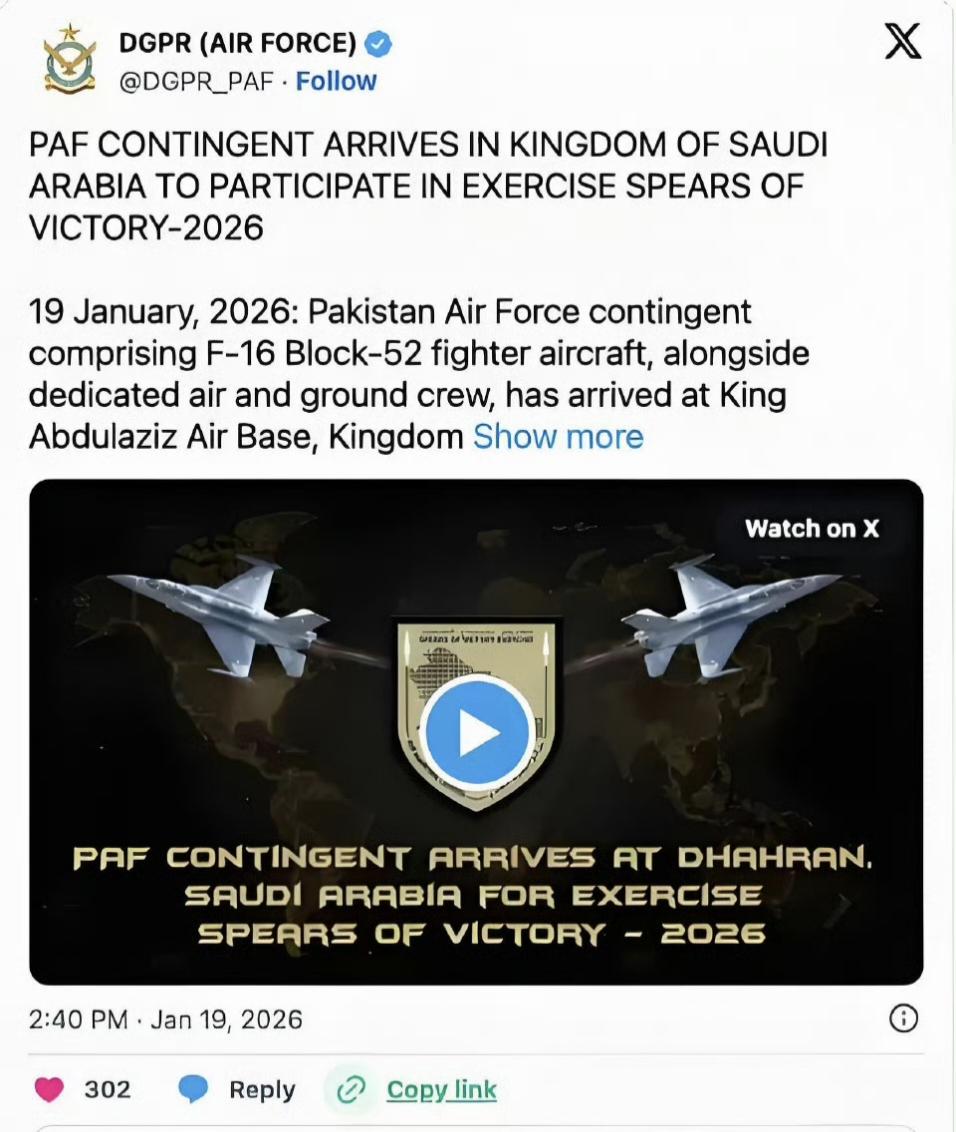 巴方参加在沙特举行的“胜利之矛 2026”多国联合空中演练。巴方派出F16 Block52特遣队,只有美制F16没有枭龙等中式装备。为什么? 这次演习有欧洲诸国还有漂亮国参加,“南亚空战”后他们都对巴方这些装备很感兴趣。