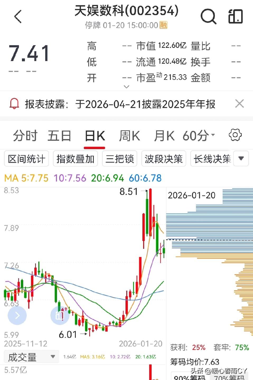 1月21日,A股预计将震荡整固,指数在4080~4126点区间波动,北向资金与金融板块会影响节奏。 主线关注半导体、贵金属、电网设备,高位题材股需谨慎。 天娱科技目前持有小仓位,不要追高,也不要盲目抄底,耐心等待放量突破或回踩支撑企稳后,再择机介入,只做有确定性的机会,以稳为主。 股市行情 科技股行情 冬日生活打卡季