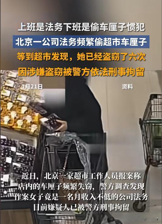 厘子?知法犯法的操作太荒唐 🍒 超市车厘子频繁失窃,监控锁定的嫌疑人竟穿着得体、谈吐干练,谁能想到她的身份藏着巨大反差?这起发生在北京朝阳的盗窃案,颠覆了所有人的认知。 近日,朝阳一家超市工作人员报案,店内车厘子屡屡失踪,角落常出现空包装盒 📦。调取监控后真相大白:一名女子专挑无人处拆开果盒,将车厘子倒进随身包,再正常结账其他商品掩人耳目。 超市负责人透露,女子盗窃并非一时兴起,从最初小盒蓝莓,逐步升级到三盒车厘子、木瓜,再到散装干果、饼干,累计作案6次 🚨。更令人震惊的是,她竟是月收入不低的公司法务,完全有能力正常消费。 💡 高学历、好工作却栽在贪小便宜上。她起初因偶然发现超市结账漏洞,便滋生侥幸心理,贪欲逐渐膨胀,明知违法仍一犯再犯,专业法律知识沦为空谈。 案发后女子追悔莫及,主动提出“以一赔十”退赔求谅解 ❌,但为时已晚。多次盗窃已涉嫌违法,目前她已被朝阳警方依法刑事拘留,职业前途尽毁。 侥幸心理是万恶之源,再小的贪念也可能酿成大错。你怎么看待这种知法犯法的行为?评论区聊聊~ 北京法务偷车厘子被刑拘 知法犯法必受惩 贪小便宜吃大亏 超市盗窃那些事