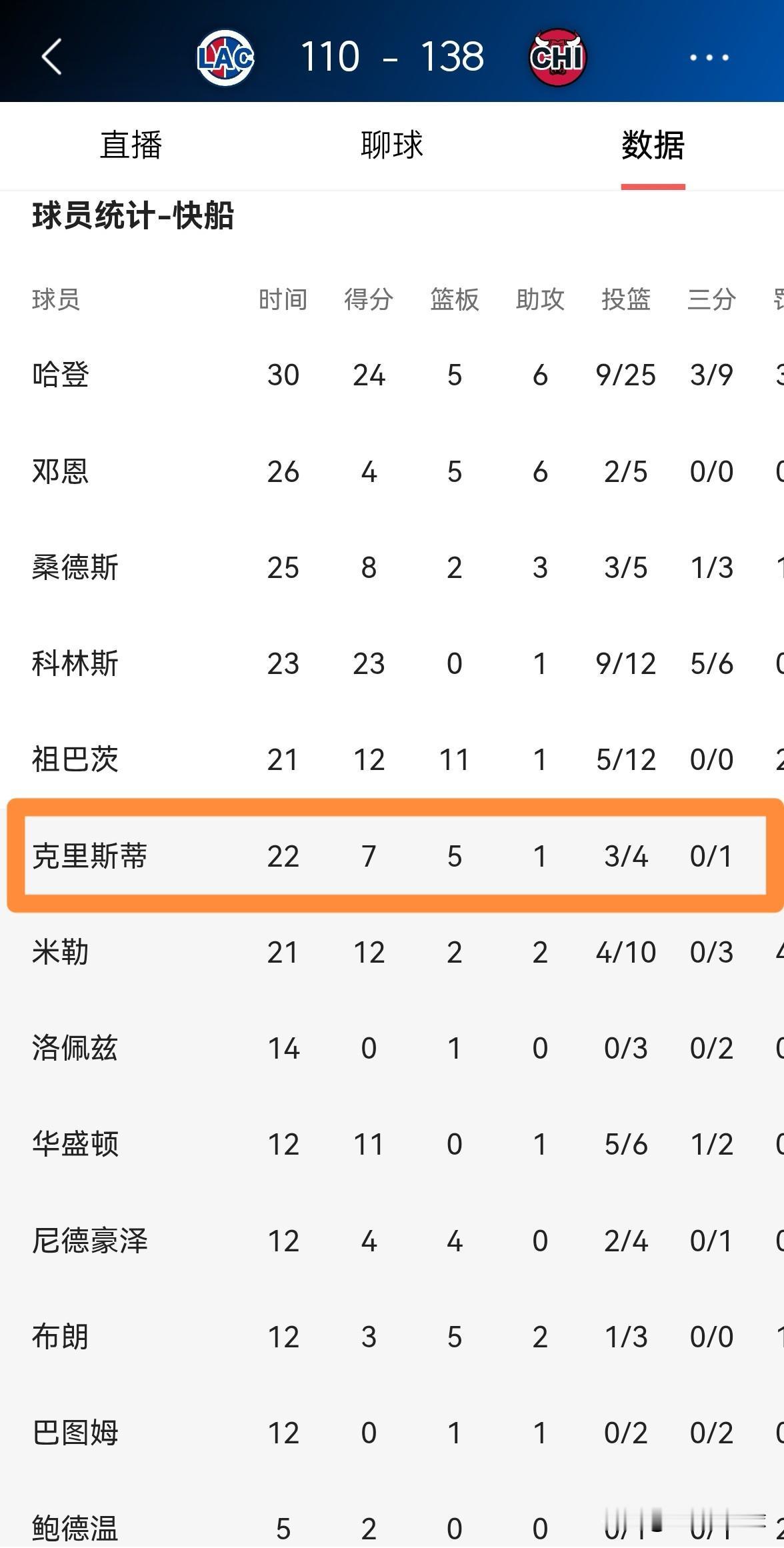 快船小将克里斯蒂绝对值得好好培养!虽然今天快船在客场以110:138惨败于公牛,但是克里斯蒂在攻防两端的表现还是可圈可点的,他在替补出战的22分钟里,投篮4中3,其中三分球1中0、罚球2中1得到7分5篮板1助攻2抢断。 老实说,以克里斯蒂的身体天赋和潜力来看,只要快船愿意好好培养,克里斯蒂绝对能够成为球队的重要轮换球员。