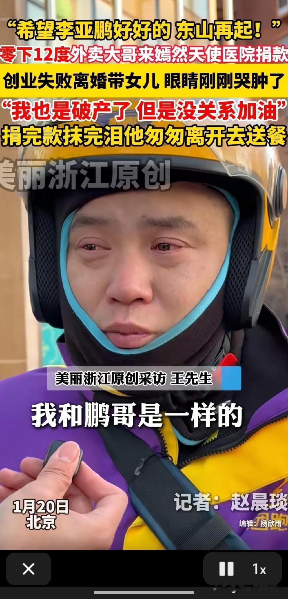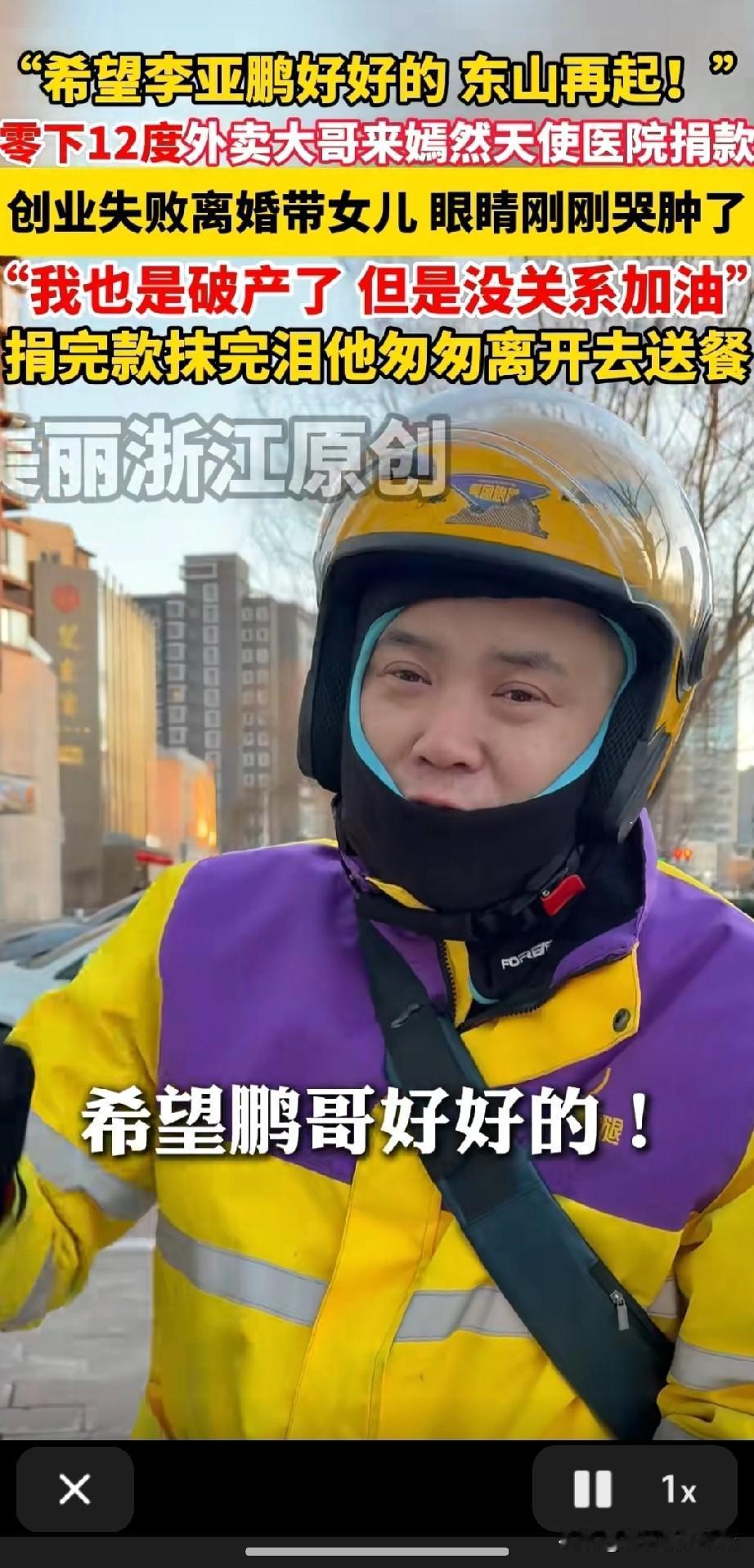 送外卖的大哥在零下12度的天气里,赶过来给嫣然天使基金捐款,他说他和李亚鹏差不多,他也破产了。也离婚了,独自一人抚养女儿。 别说相同点也真挺多的。 外卖大哥说,自己虽然没有太多的钱,但是一二百还是有的。他说李亚鹏做的是善事,这几天他看报道了,李亚鹏太不容易了。他希望李亚鹏好好的,能够东山再起。自己能力有限,但能帮一把是一把。 看到这个大哥,还真挺感慨的。大哥过的也不容易,他说最近天气冷,他送外卖时穿四条裤子。虽然一两百钱不多,但是在大哥身上,可能就是两三天的生活费。真的很不容易了。 李亚鹏做的这个事真是大爱,普通人觉得你好,才是真正的善人。给他加油,希望早日度过难关。[祈祷][祈祷][祈祷]
