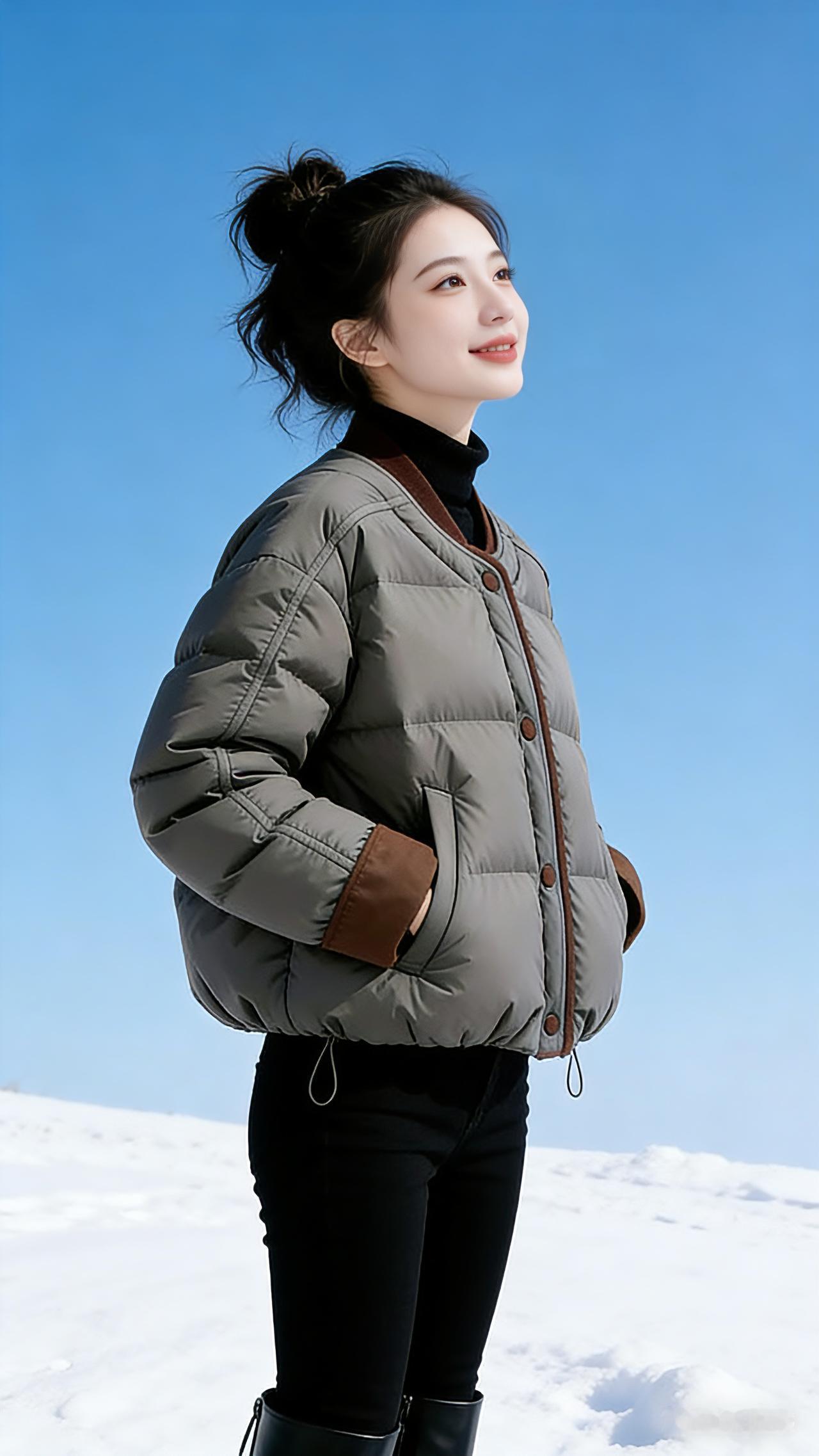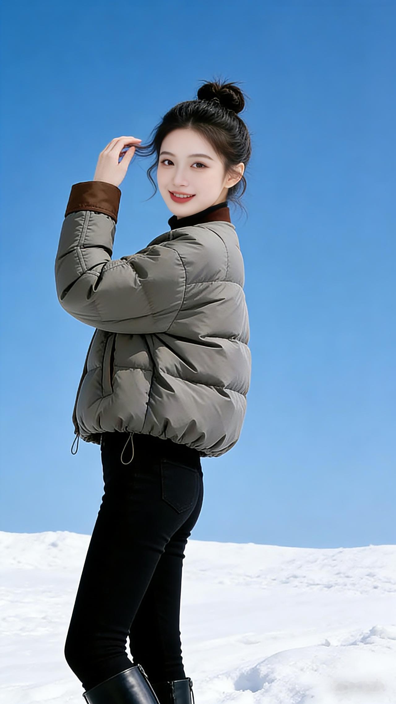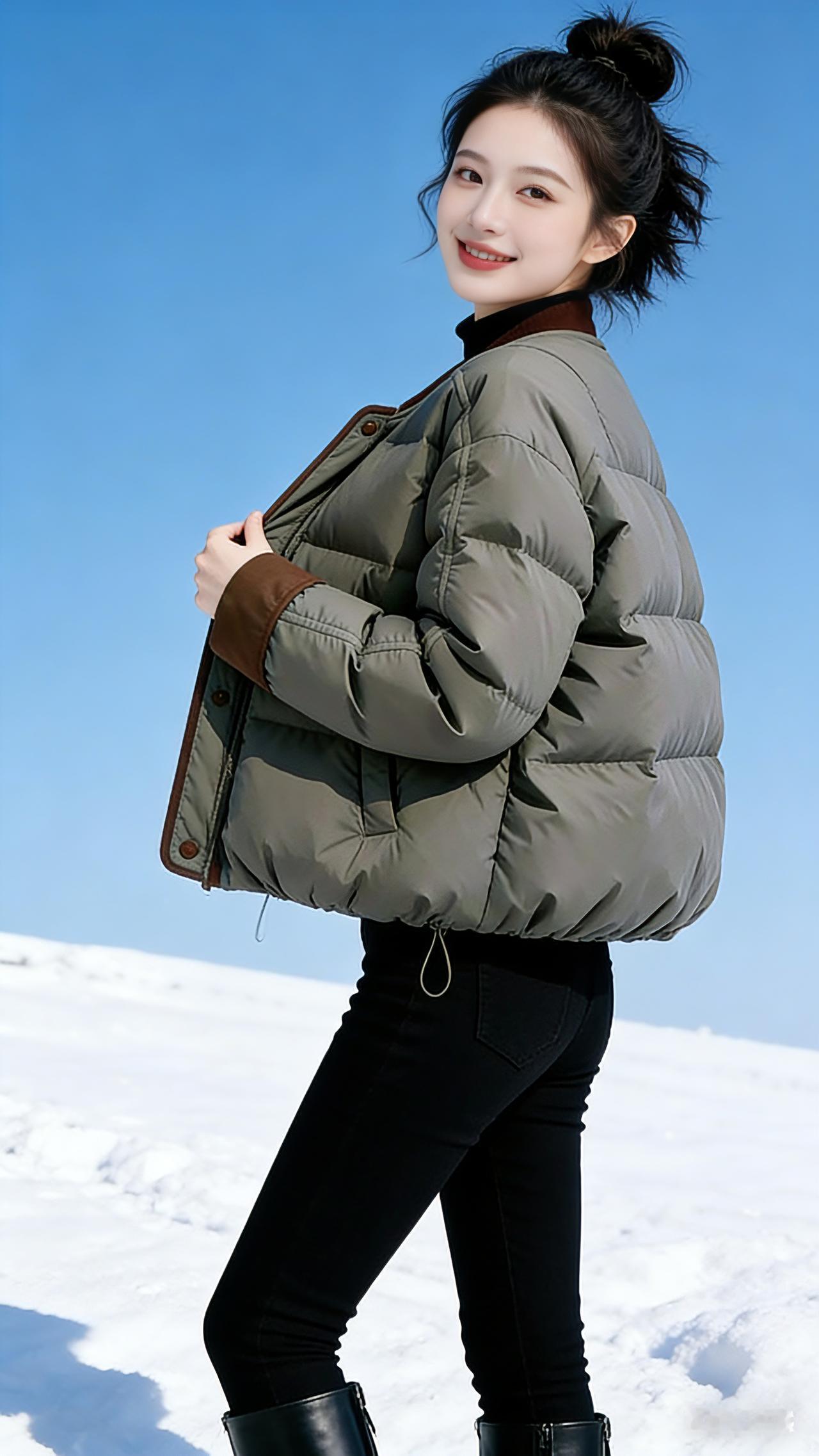 雪色里的暖 雪野无垠,天空是一块被擦亮的蓝玉,风掠过雪地,卷起细碎的雪粒,扑在人脸上,凉丝丝的。 我站在这一片白里,身上的灰绿色羽绒服像一小片沉下来的云,棕褐色的领口与袖口,是温柔的镶边。它蓬松的弧度裹住了所有寒意,只留暖意顺着衣料钻进皮肤。 我抬手拢了拢袖口,指尖触到柔软的绒布,忽然就笑了。这样的天气里,不必追赶什么,不必急着奔赴远方,只要站着,让阳光落在羽绒服上,让雪在脚下发出细碎的声响,就很好。 转过身时,衣摆扫过雪地,留下浅淡的痕迹。我抬手掠开被风吹乱的碎发,发髻上的绒毛在风里轻颤。远处的雪坡连绵起伏,像凝固的波浪,而我是浪尖上的一点暖意,被这蓬松的温柔托着,在冷与暖的交织里,站成一幅安静的画。 风穿过衣料的缝隙,却带不走半分温度。我把双手插进衣兜,掌心贴着布料的温热,仰头望向天空。阳光落进眼里,暖得像要化开来,原来冬天的浪漫,从不是躲在屋里烤火,而是穿着一件暖和的外套,站在茫茫雪地里,看天是蓝的,雪是白的,而自己是暖的高级感穿搭 冬季穿搭 新年穿搭 保暖又好看