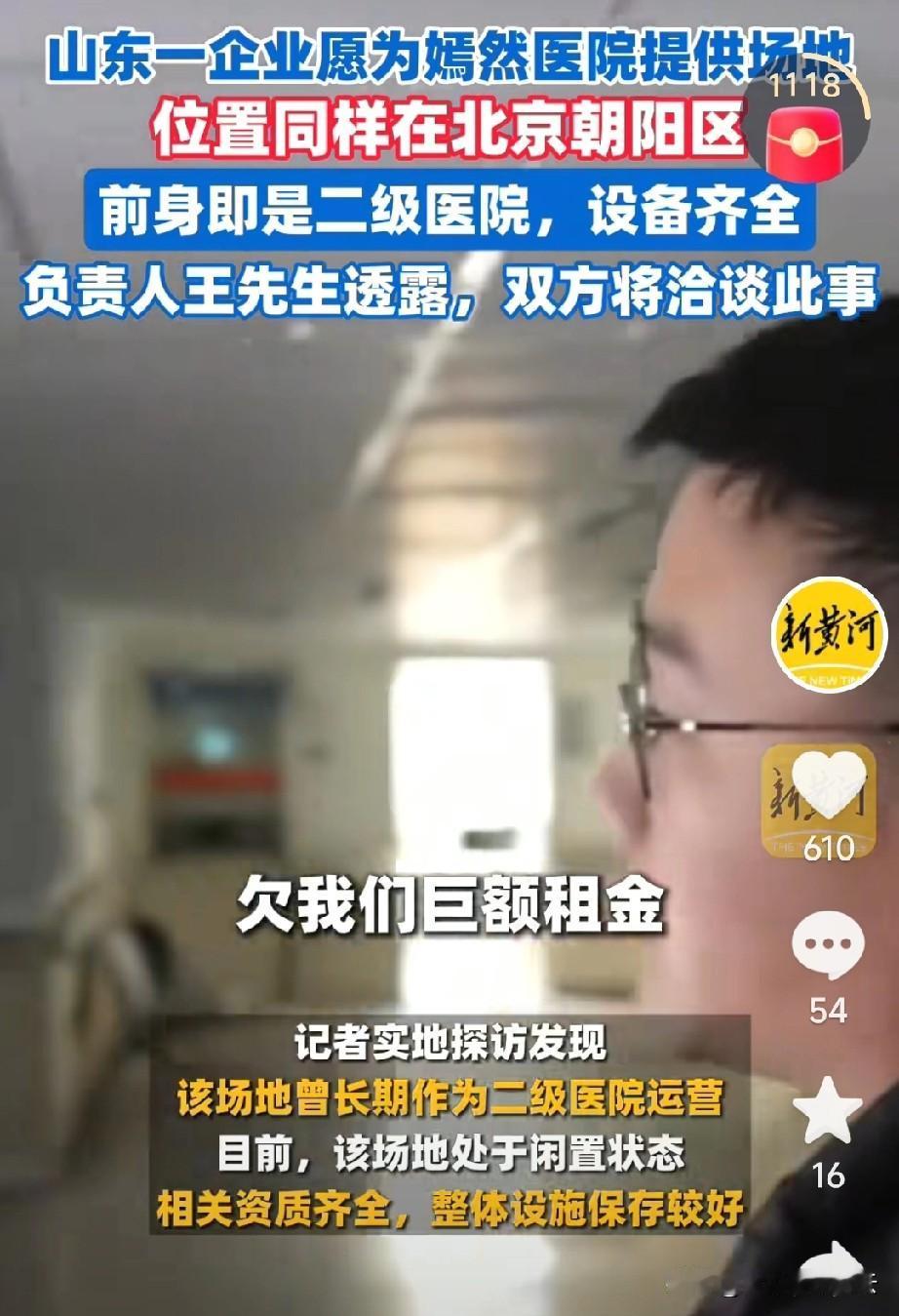 有山东的企业家提出给嫣然天使儿童医院免费提供地方,我看了一下,很靠谱。他提供的地方在朝阳区,和现在的医院在一个区,搬起家来很方便。 而且以前这个地方就是家医院,里面装修九成新,里面的设备也很齐全。那个老板说,楼房是他自己盖的,所以不用担心会收回。前一家医院也是因为拖欠房租,所以里面的设备就顶了房租,有设备,李亚鹏他们也省事多了,可以更快的让医院重新运行。 现在双方已经联系上了,正在洽谈此事。我觉得这是个大好事,如果还在北京,对医院还有唇腭裂患者,都是最好不过的了。