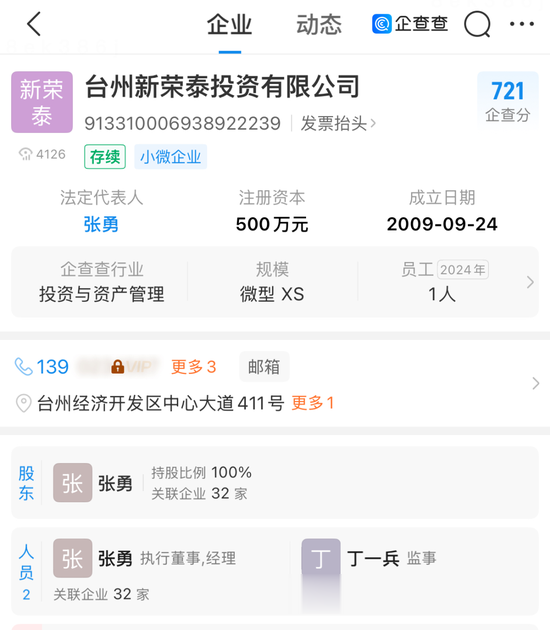 公开资料显示,台州新荣泰投资有限公司成立于2009年,法人为高端中餐品牌新荣记创始人张勇。新荣记成立于1995年10月,在浙江省台州临海市三角马路地下室创立了第一家“新荣记食府”。