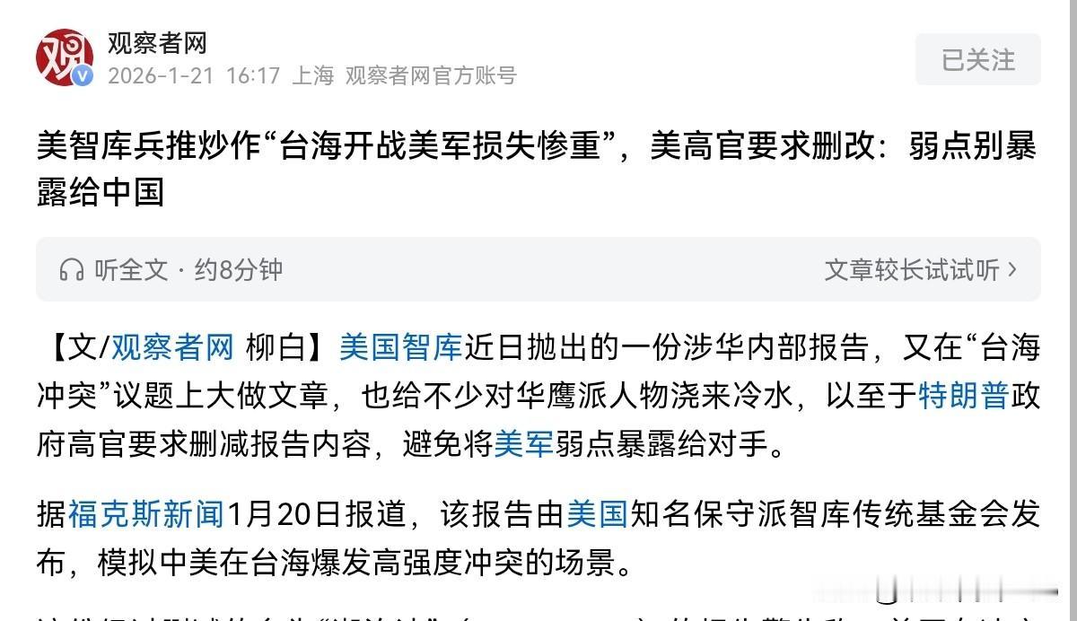 “台独”分子看见这样的报道估计要瑟瑟发抖了!美智库兵推,美国将惨败!美军方高官急得删报告!1月20日,根据外媒报道,美智库模拟了新的台海冲突场景,而模拟结果显示,在高强度冲突中,美军陷入作战极限的时间不足中国的一半。部署在主要前沿基地的美军及盟友战机,最高有90%会在冲突爆发初期被摧毁在地面,对手会同时打击机场跑道、燃料库、指挥设施和停场战机。 而这将导致美军在冲突初期就陷入作战极限,而与美国相比,中国具备将高强度作战持续数月之久的能力。而看到该智库的兵推结果曝光之后,美国高层国家安全官员审阅时,要求用黑色涂抹掉部分具体细节,美战争部更表示,不认可、不验证,第三方机构的分析报告。很显然,看到美国智库做的这一兵推结果,美军方是直冒冷汗,而这对于“台独”分子而言,可能更是晴天霹雳。 因为,这样的兵推结果显示,不管是美国,还是日本,如果这些域外势力胆敢介入我们解决台湾问题,其结果都是惨败。并且,拖的越久,美国军工持续能力会越差。“台独”分子妄图以武谋独,倚外谋独,但这注定是死路一条,绝无成功的可能。当然,兵推是兵推,从实际的台海局势来看,我们对台湾的掌控力度越来越大,我们的军力越来越直接延伸到台湾岛。 现在岛内“台独”分子看起来很嚣张,其不断的编预算,打击岛内支持统一的声音,但是这更加反映其内心的惶恐不安。我们刚进行了军演,也曝光了“斩首”战术,对于我们而言,现在我们解决台湾问题的细节越来越浮出水面,这说明我们已经做好了准备。如果“台独”分子狗急跳墙,我们必然是雷霆一击。“台独”分子是瓮中之鳖,这不是虚言,统一破局时刻可能已经不远了。
