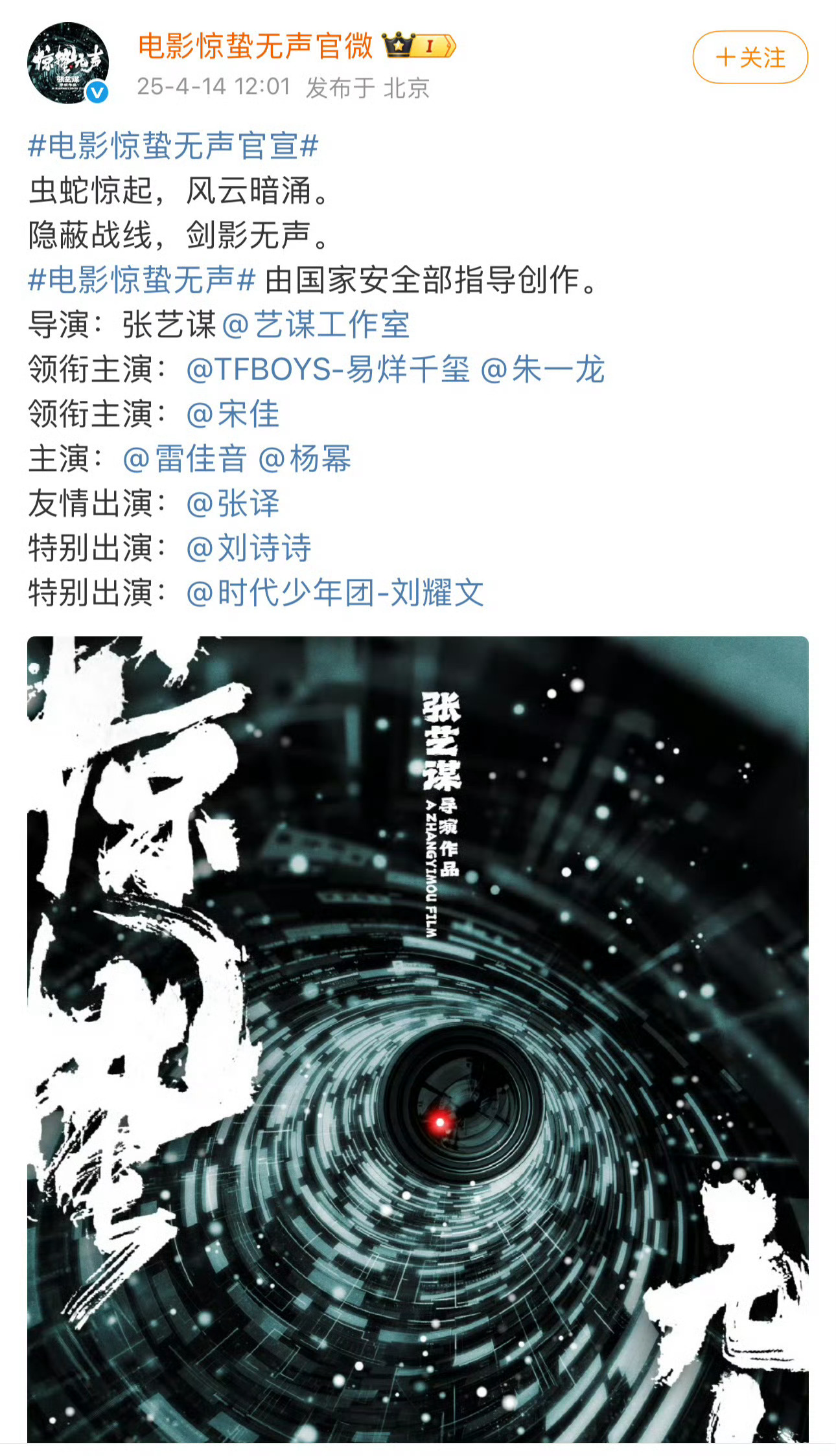 惊蛰无声张艺谋执导,易烊千玺、朱一龙、宋佳、雷佳音、杨幂、张译、刘诗诗参演的电影《惊蛰无声》,开通了官抖!!!不出意料的话也是定档春节档上映🎬