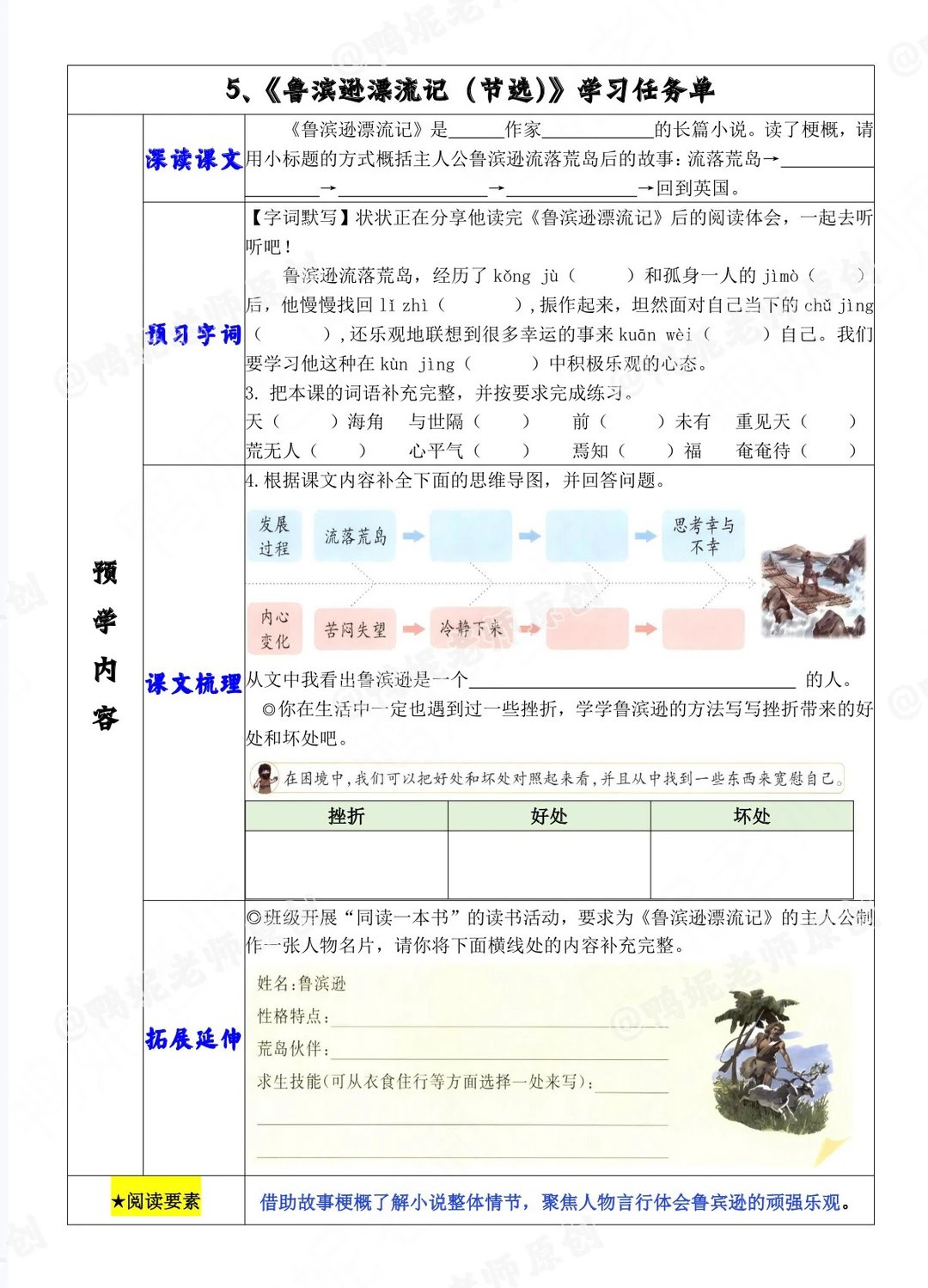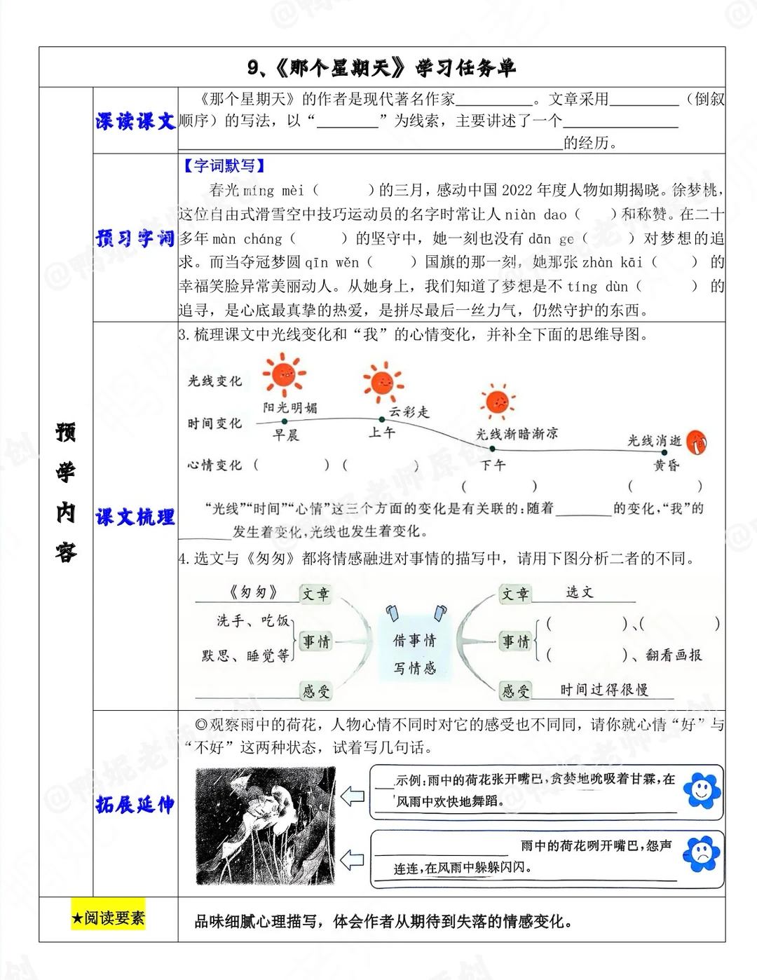 历经大半个月,围绕每个单元的语文要素,每一个的重难点,结合课本习题,精心挑选和整理的预习任务单,终于完成了! 学生如果提前在家里预习,课堂上效率会更高,直击重难点,把基础知识和思考的时间尽量留在课下。 ▫️预习任务包含:基础字词,课文梳理、拓展积累 ✅带有层次性的思维导图,紧扣每课的语文要素 ✅梳理课文脉络,助力孩子快速把握文章结构与主旨 ✅预留思考空间,孩子能带着疑问进入课堂,从此听课更高效!