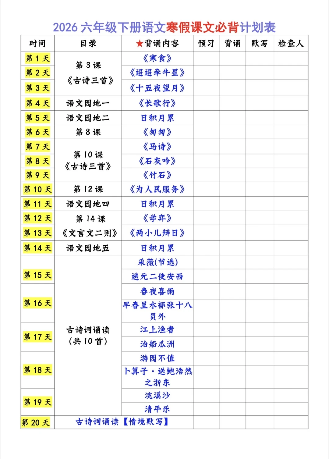 2026六下寒假预习【必背内容】默写单+打卡表
