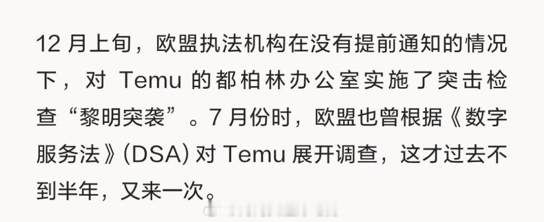 拼多多旗下Temu土耳其遭遇黎明突袭Temu土耳其办公室被抄家拼多多旗下Temu办公室,时隔一个月再 被抄据媒体记者了解,当地时间1月21日上午,Temu土耳其办公室突然遭“黎明突袭”,办公室被查抄、员工全被传询,拼多多方面回应“事发突然无预警,但会积极配合调查,对合规有信心”。而这距离12月初欧盟监管突袭其爱尔兰都柏林欧洲总部,才刚过去一个多月,短短40天内两度被查