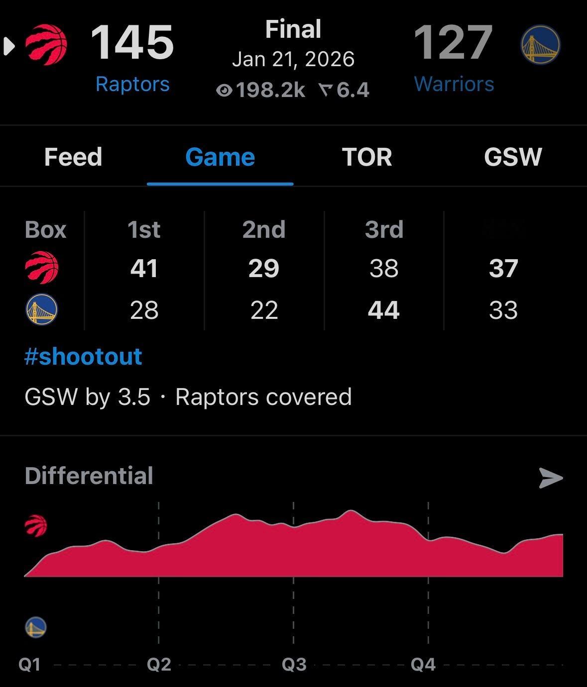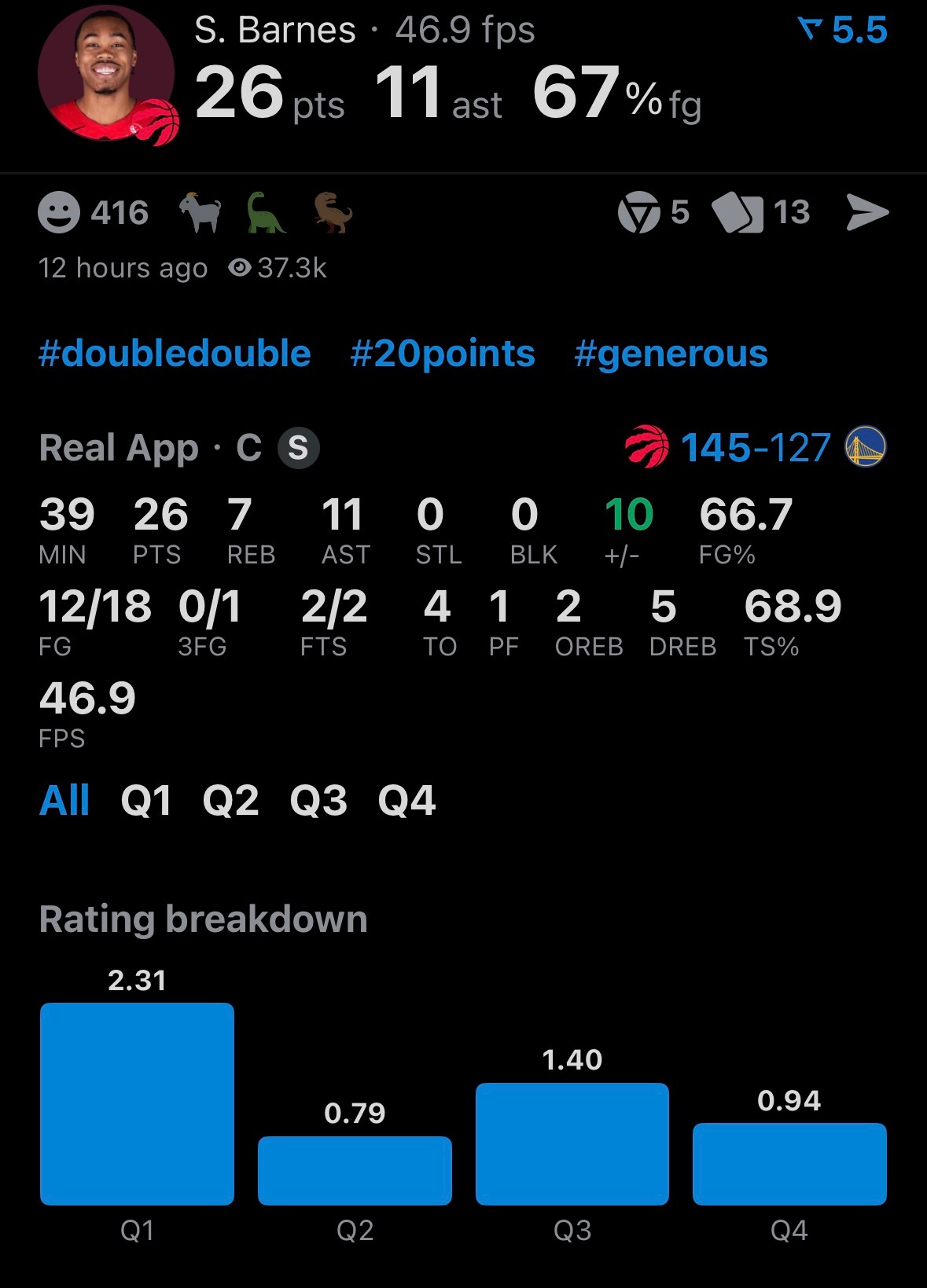 猛龙终结勇士4连胜库明加时隔一个月上场得20分猛龙队史常规赛最高得分——145分,也是科尔时代勇士最高失分(24念加时输湖人也是丢了145);猛龙21/34的三分球,61.8%的命中率,也是队史最准;奎克利生涯新高40分,还有10个助攻,历史上另外一位能干到40+10助攻&80%命中率的,只有张伯伦;上一个猛龙40+10助攻的还是2004年的卡特