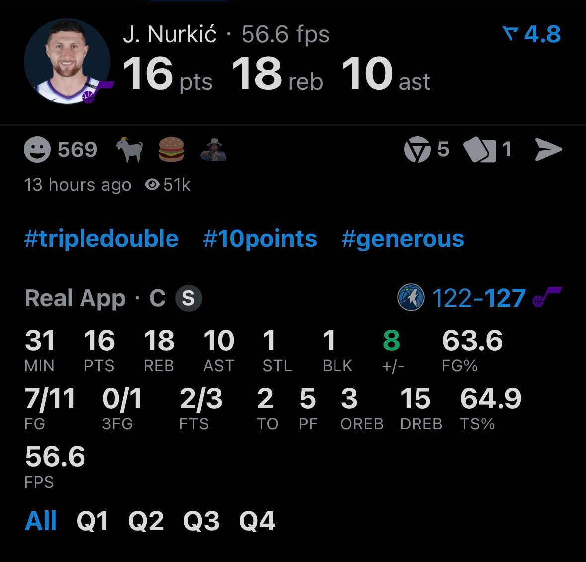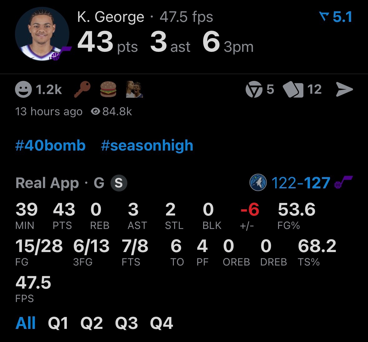 爵士战胜森林狼爱德华兹空砍38分何为空砍呢,爱德华兹过去两场比赛得了93分,这是森林狼队史连续两场比赛得分最高的数据,也是华子本赛季第13次35+,追平队史单赛季第二多,然后,还是没赢;三连败,本赛季最长;见证了乔治的生涯新高,见证了努尔基奇的生涯第二次三双——歪个楼,过去二十年,爵士队只有4个球员拿到过三双;大师这个临场指挥啊,哎,虽然之前连胜时候他也在评分上拿过高分,但是认真说他临场确实不行,暂停死板换人刻板,没有上限啊