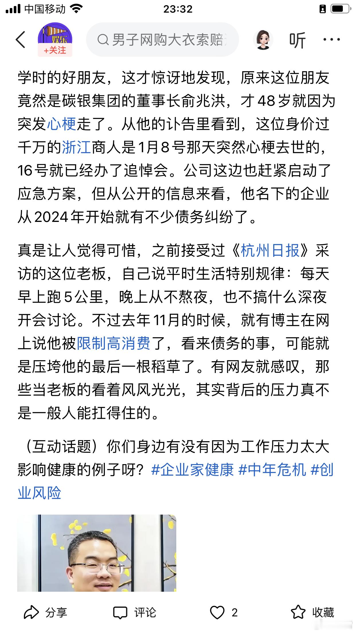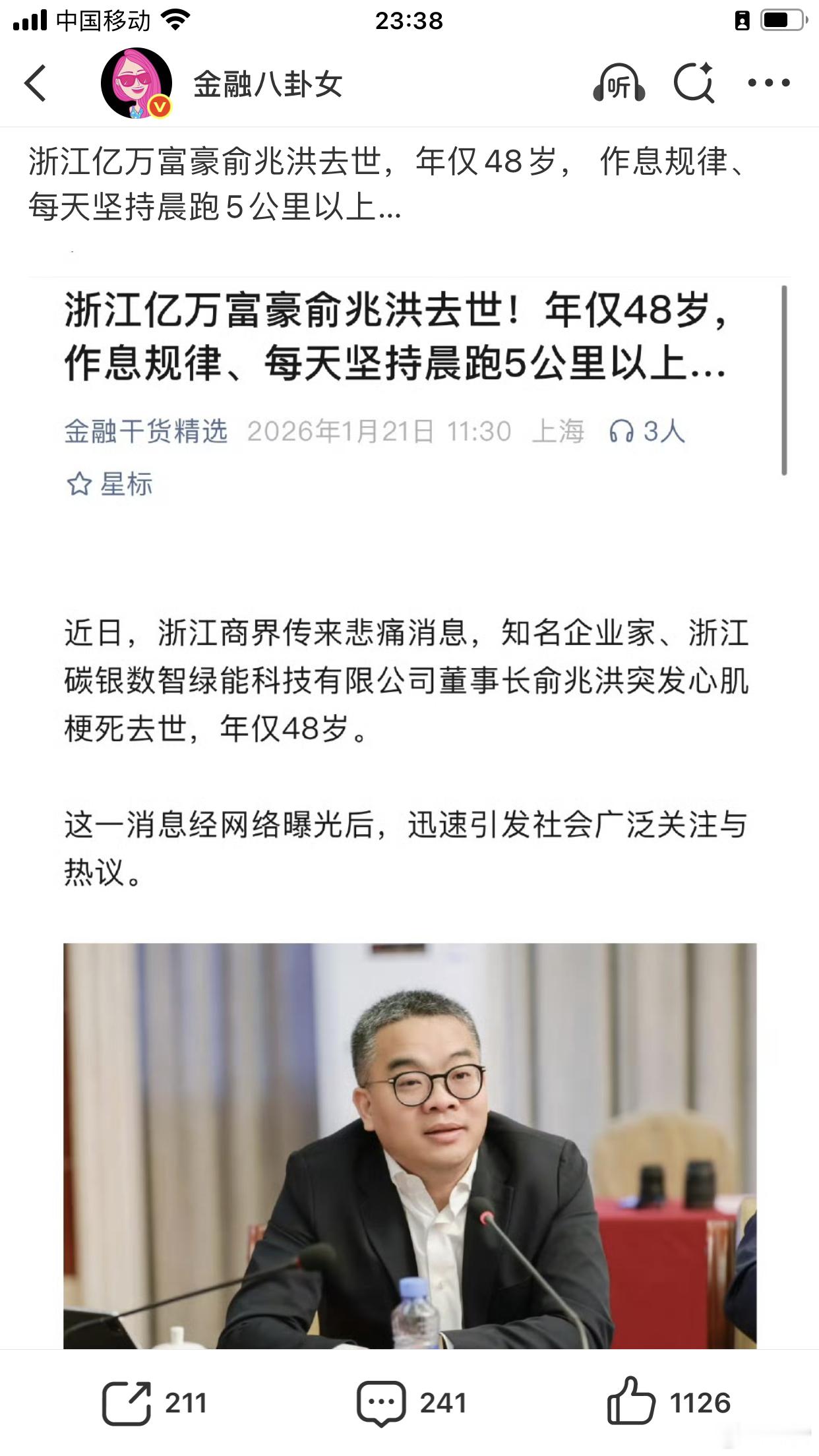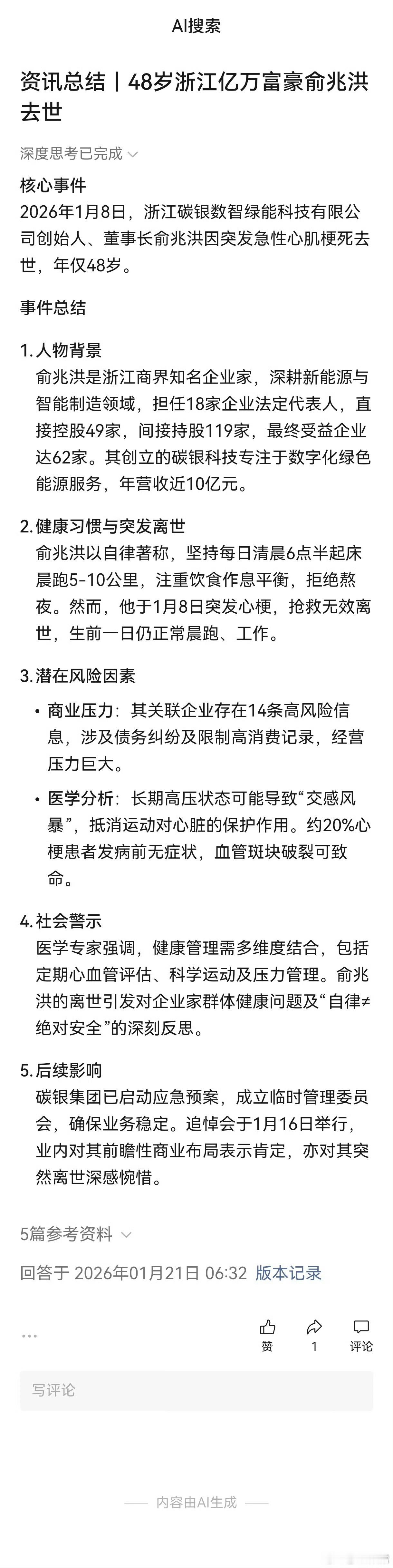 杭商俞兆洪48岁年纪轻轻,比我还小9岁,每天6点半跑步倒在大寒前,头发是不是跑白了还是债务搜到了讣告死因:突发心梗。前一天还在跑——浙江碳银数智绿能董事长俞兆洪,突发性心肌梗死猝然离世,年仅48岁。俞兆洪是圈内出了名的健康达人。每天6点半起床,坚持晨跑5-10公里。 史韵探秘:众所周知,俞兆洪在业内被誉为“健康达人”。于2025年9月举行的一次业内交流会上,俞兆洪先生细致地分享了他的日常作息安排:每天清晨6点半,他便会准时从睡梦中醒来,完成洗漱之后,便沿着钱塘江畔漫步慢跑,行程控制在5至10公里之间。慢跑结束后,他便提前步入公司办公室,开启充实的一天工作。他长期坚持晨跑。自创办碳银公司以来,俞兆洪更是有意摒弃了创业初期对早餐的忽视,对饮食与作息的平衡给予了极高的重视。在接受《杭州日报》的独家访谈时,他透露,在创业的后期阶段,他已经戒掉了熬夜的恶习,也不再像创业初期那样,在深夜时分突然召集员工举行紧急会议。他坚信,企业的成长应当保持稳健的节奏,员工的工作在保持适当的紧张感的同时,也要确保其可持续性。在同事们的眼中,俞兆洪洋溢着无穷的活力,对待工作严谨专注,且凭借着不懈的锻炼,他始终维持着令人赞叹的精神状态。每当清晨跑步归来,他总是神采奕奕地踏入公司,这一场景早已成为了众人习以为常的风景。日复一日坚持晨跑的俞兆洪,却不幸遭遇心梗的突然袭击,这一变故使得许多人对于“运动有益心脏”这一传统理念产生了深深的疑虑。即便持之以恒地进行体育锻炼,心脏仍有可能遭受急性梗塞的侵袭。据心内科专家分析,尽管锻炼能够增强血管的弹性和减少血脂,对心脏健康极为有利,但这并不能完全避免心梗的发生。心梗往往是由多种复杂因素共同作用造成的。即便那些坚持锻炼的人,如果存在血管隐患、运动不当或者忽视其他健康生活习惯,依旧可能遭遇心梗的威胁。在深入剖析俞兆洪的病例后,医生指出,企业家群体普遍面临着巨大的工作压力。在长期的高压环境中,人体会不断分泌应激激素,这可能导致血压升高、心率加快,从而给心脏带来额外的压力。这些症状很可能是引发心梗的重要因素之一。公开信息显示,俞兆洪所控制的企业中,已有9家发布了风险预警,总计涉及高风险信息14则,警示信息高达94条。与此同时,他的个人信用记录中也出现了3条限制高消费的记录。这些数据或许暗示了他在商业活动中所承受的压力,这远非外界所能完全洞察。此外,医学研究指出,约20%的心梗患者,在病发初期并无明显症状,但其体内血管斑块实则已悄然存在数年。尽管运动有助于减缓斑块的增长,却无法根除已形成的斑块。若斑块突然破裂,形成血栓,便可能引发急性心肌梗死。此亦昭示,即便那些规律锻炼的人群,若隐匿的血管隐患未能得到及时察觉,仍存有遭遇心脏急症的可能。俞兆洪的离世,再次将企业家群体的健康问题置于公众关注的焦点。在大众的普遍认知中,成功的企业家仿佛总能享受到更为优越的健康管理待遇。然而,事实却是,他们往往承受着高强度的职业节奏、持续的竞争压力以及密集的社交应酬,这些都令他们成为心脑血管疾病的高发人群。此事件中,俞兆洪“自律却不幸突发心梗”的强烈反差,使众人深刻领悟到健康管理所涉及的复杂性——仅依赖单一的运动习惯,尚不足以抵御所有健康风险,全面而细致的健康监测与风险预警显得尤为关键。心血管领域的专家指出,对于40岁以上的中年群体、家族中患有高血压或糖尿病者,以及长期处于高压工作环境中的职场佼佼者,即便他们坚持规律锻炼,也务必定期进行全面的心血管健康检查。这涵盖了血脂、血压、血糖的常规检测,以及心电图、心脏超声等关键性检查,旨在早期识别可能存在的隐蔽风险。此外,运动训练需遵循“循序渐进、因人而异”的原则,切勿急功近利,盲目增加运动强度。在进行运动前,必须进行彻底的热身准备,运动期间需密切关注身体所传达的任何不适信号。若出现胸痛、胸闷或头晕等症状,应立刻停止运动并休息。此外,戒除烟酒、坚持低脂饮食、保证每晚七至八小时的优质睡眠,以及科学管理压力,这些健康的生活方式若能与适度运动相结合,方能构筑起一道坚实的护心堡垒。俞兆洪的离世,在浙江商界引起了广泛的关注与波澜。众多同行业人士纷纷表达出深沉的哀悼之情,无不感慨于“天妒英才”这一悲剧的残酷。昔日并肩作战的同事纷纷对他赞誉有加,称赞他“勤勉不辍、洞察敏锐,在新能源领域的战略布局上展现出非凡的远见与卓识”。然而,也有人对此深感痛惜,对于这位格外珍视健康之人士的突然离世,不禁发出难以置信的叹息。