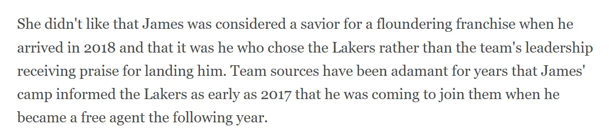 继续钓鱼🎣!ESPN:珍妮-巴斯不满詹姆斯被视为救世主,认为是他选择湖人!ESPN记者Baxter Holmes:在勒布朗加盟湖人后的舆论环境中,湖人老板珍妮巴斯对外界围绕詹姆斯的“救世主”叙事曾产生不满情绪。报道称,巴斯并不认同外界将湖人复兴的功劳完全归于詹姆斯本人,尤其是不满他在2018年加盟后被普遍视作“拯救湖人”的形象。她认为,是詹姆斯选择了湖人,而并非湖人被动等待一位救世主的降临。ESPN指出,多年来,湖人内部消息人士始终坚称,詹姆斯阵营早在2017年就已向湖人方面明确表示,他将在次年成为自由球员时加盟球队。在这种背景下,巴斯认为,外界对詹姆斯加盟一事的叙述方式,并未充分体现湖人管理层在其中所扮演的角色。 珍妮巴斯驳斥对詹姆斯不满传闻