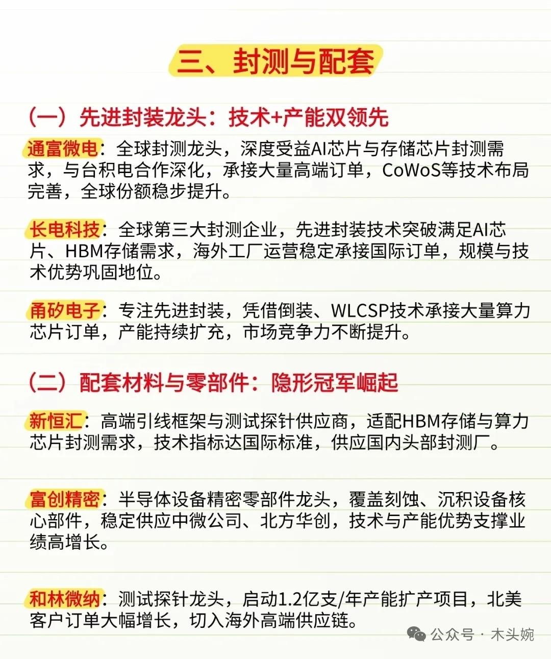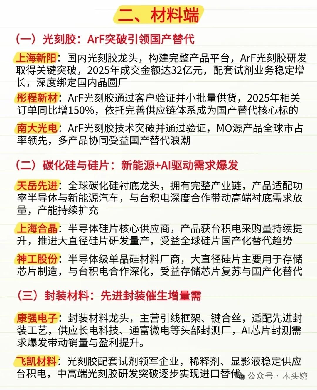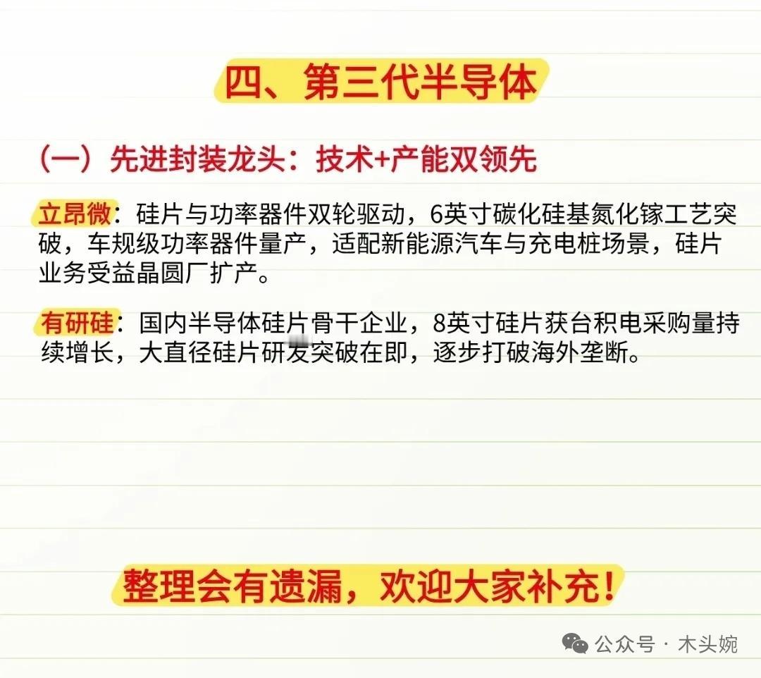 挖到宝了!国产半导体核心标的全图谱,看懂这几张图就够了。 全球地缘科技竞争加剧叠加“自主可控”政策导向,国内晶圆厂加速扩产,设备、材料、封测环节的国产替代率正快速提升。国产半导体设备及材料核心标的全梳理。从设备端的平台型龙头,到材料端的光刻胶、碳化硅,再到封测与配套的隐形冠军,以及第三代半导体的技术突破,这份产业链图谱清晰勾勒出国产替代的核心脉络。 北方华创国产半导体设备的“平台型龙头”;盛美上海是国内半导体清洗设备的核心龙头;康强电子是国内引线框架龙头,键合丝产能国内第二,深度绑定存储与封测龙头;彤程新材是国内光刻胶平台型龙头…… 本内容仅为风险梳理,不构成投资建议。半导体行业投资需密切关注地缘政策动态、技术突破进度、下游需求变化及企业财务健康度,理性评估风险与收益,谨慎决策。