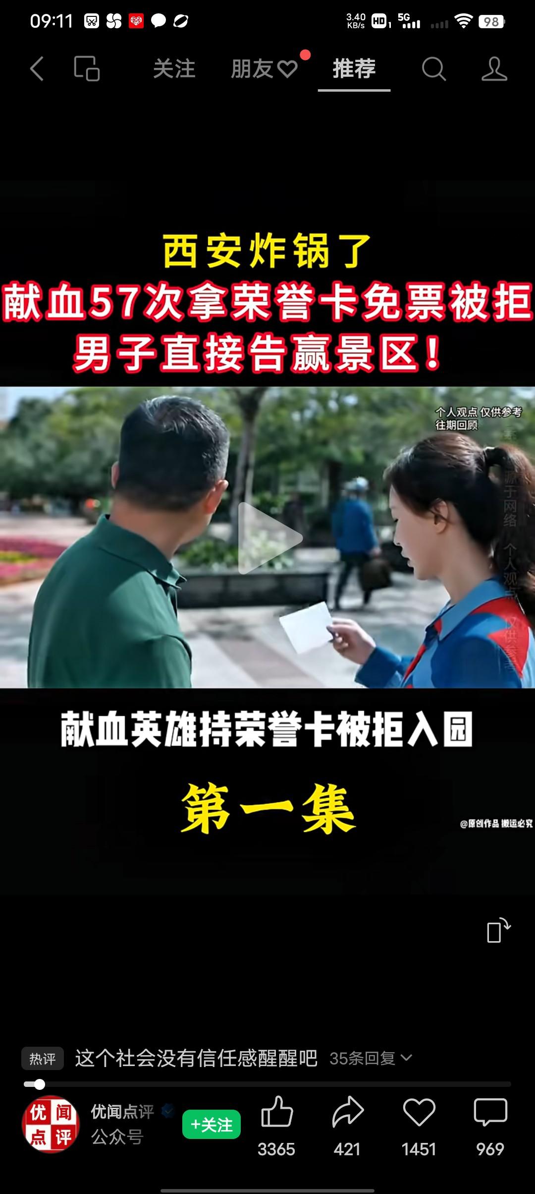 西安炸锅了! 据极目新闻1月21日报道,37岁的西安市民吕先生,用十余年的坚持书写了一份热血答卷,累计无偿献血57次,捐献血量高达2.2万毫升,这个数字相当于五个成年人的全身血量的总和,足矣挽救数十条在生死边缘挣扎的生命。 凭借这份沉甸甸的奉献,他手握无偿献血荣誉卡,这张卡片就像一枚闪耀的勋章。按照当地规定,可以享受市属级景区免费入园的优待,可谁也没想到去年12月21日,吕先生手握着荣誉卡前往西安赵公明文化景区游玩时,却被工作人员泼了一盆冷水,对方已未接到免票相关通知为由,拒绝执行优待政策,坚持要求他支付50元门票才能入园。 这份冰冷的拒绝像一根刺深深地扎进了吕先生的心里,更有无数网友为这位献血英雄鸣不平!有网友在下面说醒醒吧,这个社会已经不能让人完全相信了,有人说57次的无偿献血,竟然换不来一张50元的门票,就问这57次的无偿献血到底值不值?还有人说你无偿献血人家卖钱为什么呢?中介给医院介绍人献血400毫升就能卖400块钱!还有人说这就是教训,没人能同情,也没有后悔药给你吃!
