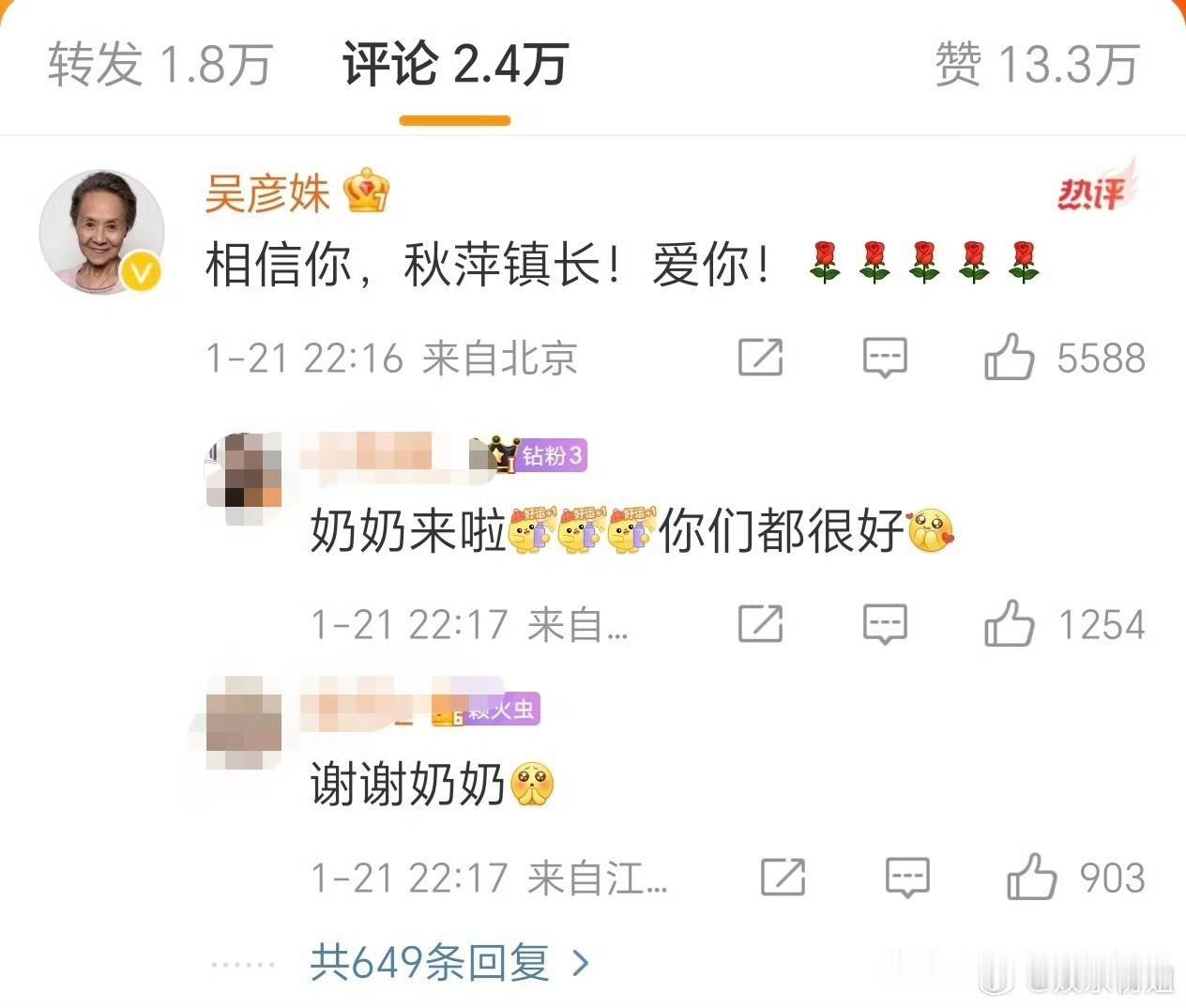 我们永远为演员之间的真诚互动而感动! 赵丽颖置顶了个吴彦姝老师的剧中合照,并配文“奶奶,您看我,您看月海,会越来越好的[心]”,吴老师在评论中回复“相信你,秋萍镇长!爱你!”,超好的奶奶和李秋萍。 《小城大事》中"杨奶奶"对李秋萍的无声支持深入人心,观众将戏内情感延续至戏外,这是祖孙的双向奔赴啊,在剧中杨奶奶在的地方就是秋萍的避风港,在局外赵丽颖和吴彦姝老师也是忘年交,美好的人总能碰撞出火花的。