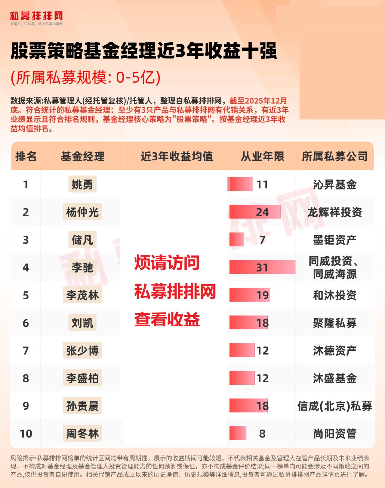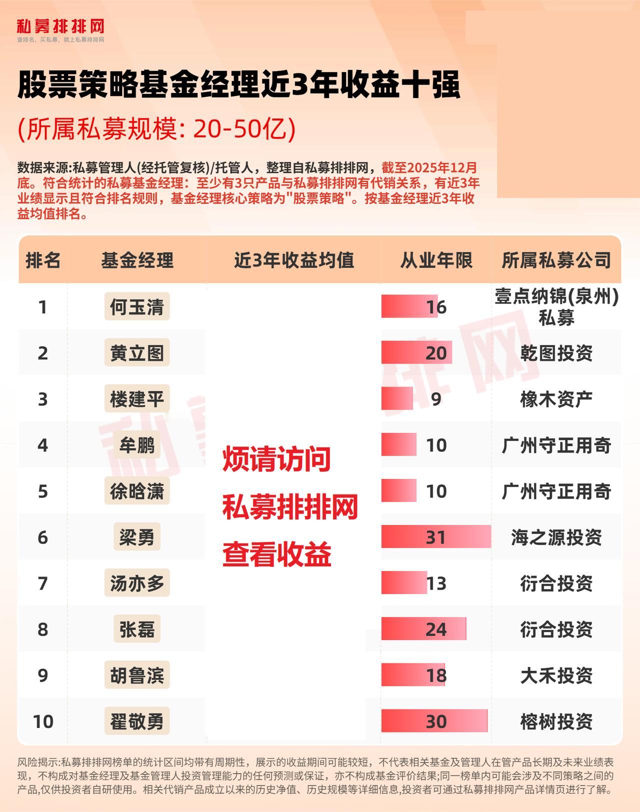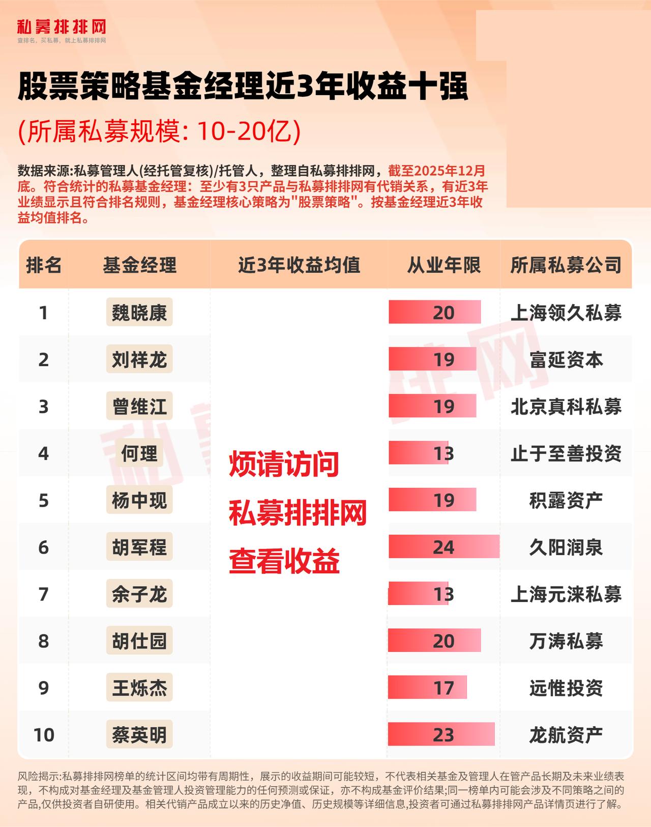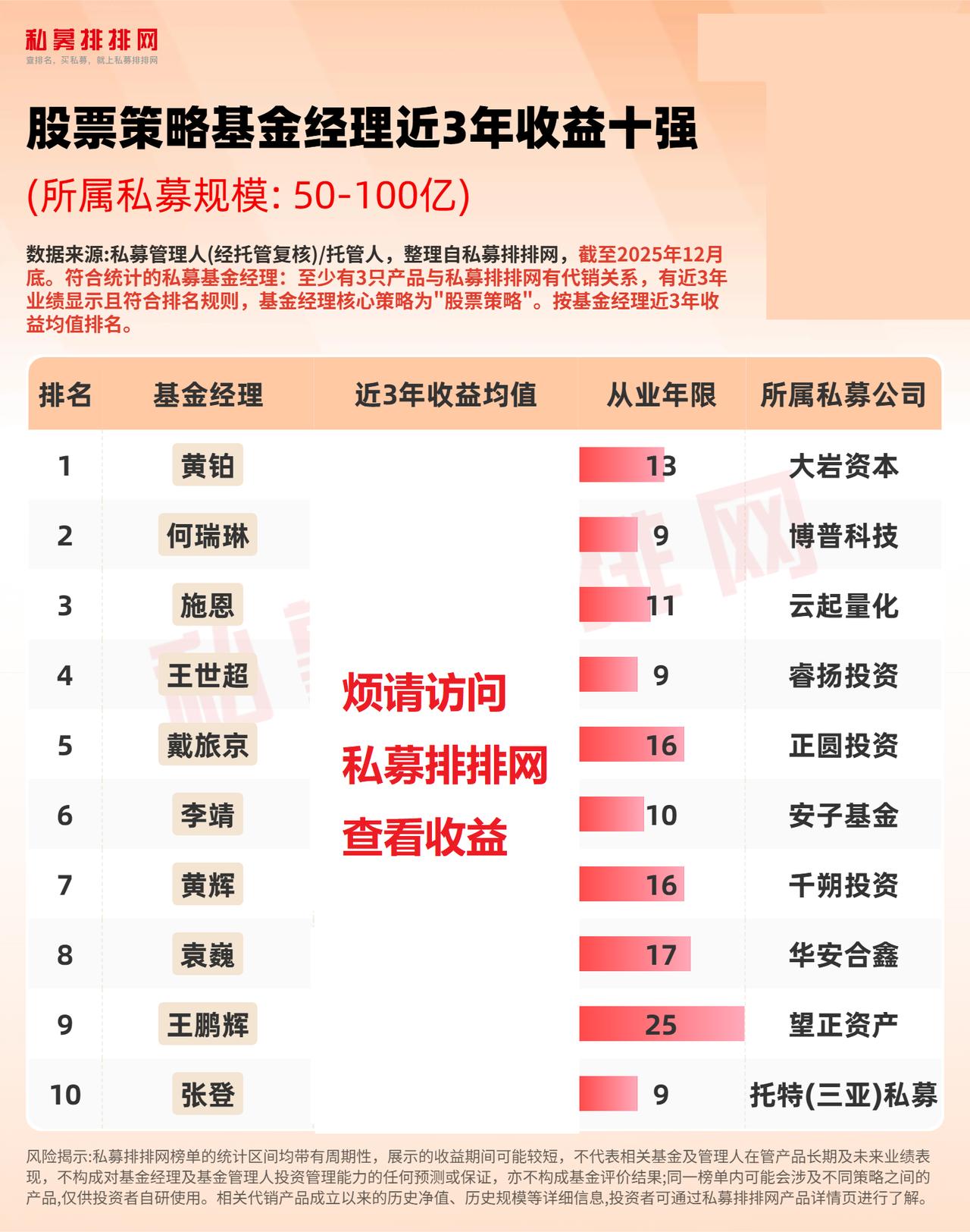 私募基金经理近三年业绩排名(股票策略) 点击查看私募基金经理最新业绩: 具体来看,按近3年收益均值排序,百亿私募基金经理排名前十名依次为:但斌、郭学文、陆航、谢晓阳、孔镇宁、王琛、王一平、朱晓康、张伟、何文奇。 1、但斌 百亿私募基金经理排名榜榜首,东方港湾创始人但斌,近3年收益均值147.23%。从业年限达30余年,曾任职于国泰君安证券、大鹏证券资产管理部。出版《时间的玫瑰》一书,弘扬价值投资理念。 2、郭学文 茂源量化创始人郭学文,近3年收益均值101.65%。从业20年,曾先后创立中企通讯技术有限公司、北京望海康信科技有限公司,均被上市公司收购。编写了国内较的高频交易策略,并将体系化管理应用到量化投资领域。 3、陆航 百亿私募基金经理排名前三强,复胜资产创始人陆航,近3年收益均值100.55%。从业二十余年,曾就职于海富通基金、国元证券。累计管理规模逾百亿元。 4、谢晓阳 天演资本创始人谢晓阳,近3年收益均值97.99%。从业十余年,曾于伦敦自营交易公司TibraCapital任投资经理,负责欧洲各国股指期权做市。 5、孔镇宁 私募基金经理排名前五强,玄元投资副总经理孔镇宁,近3年收益均值94.44%。十余年全球市场量化投资经验,在美国担任投资经理期间,累计管理规模超过30亿美元。 6、王琛 九坤投资创始人王琛,近3年收益均值93.33%。拥有十余年量化交易经验,曾任职于美国MillenniumL.P.的量化交易策略团队。 7、王一平 进化论资产创始人王一平,近3年收益均值87.95%。十余年资本市场投资经验,经历市场多轮牛熊周期,是国内少数兼具主动管理与量化投资能力的策略型基金经理,在百亿私募基金经理排行榜中颇受市场关注。 8、朱晓康 龙旗科技创始人朱晓康,近3年收益均值84.91%。曾任职于巴克莱国际投资人(BGI)的科学主动股票投资部(后BGI并入贝莱德资产管理公司BlackRock),管理多只美国对冲基金产品,并且从事全球市场的量化策略研究。