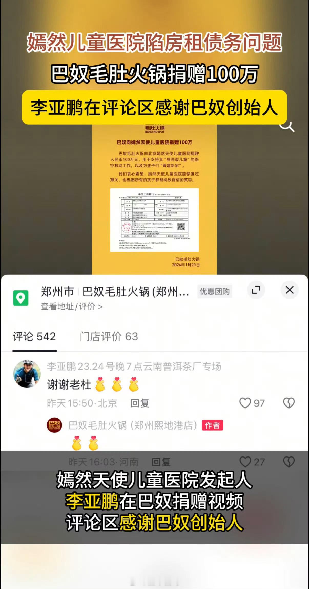 李亚鹏感谢巴奴捐款一纸捐款单,一句谢谢老杜,人间温暖不过如此,百万善意托举患儿笑容,李亚鹏的真诚致谢联结心意,公益路上,企业与爱心者的双向奔赴,让善意更有力量❤️李亚鹏在评论区感谢巴奴创始人