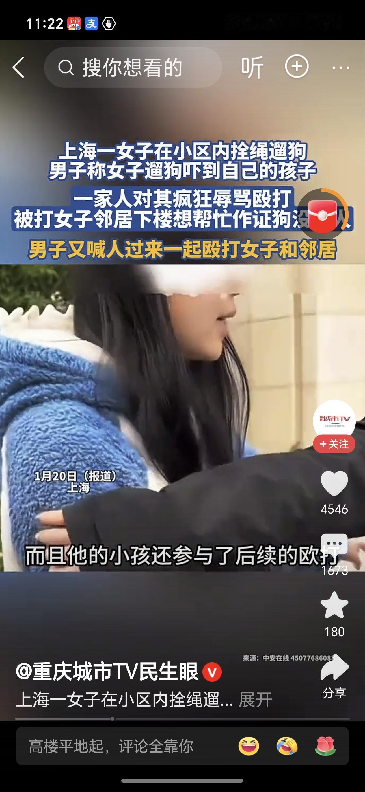 女子牵绳遛狗遭殴打 警方已介入 上海这事儿太离谱!近日上海一女子牵绳遛着小狗出电梯,与一家四口擦肩而过时,有人突然尖叫,女子回了句“吓到我了”,就遭对方辱骂。女子想走,却被追着殴打,打人男子还称狗吓到孩子、咬到孩子。 之后警方调监控,根本没见狗狗扑咬。 还有个女邻居上前帮忙作证、想把狗送楼上,也被一起打了。打人男子疑似喝酒,还放狠话“就是要打你们”。目前警方已立案,也在对伤者伤情鉴定。牵绳遛狗没毛病,怎么就被追着打了呢,是否还有其它隐情,坐等后续公正处理!