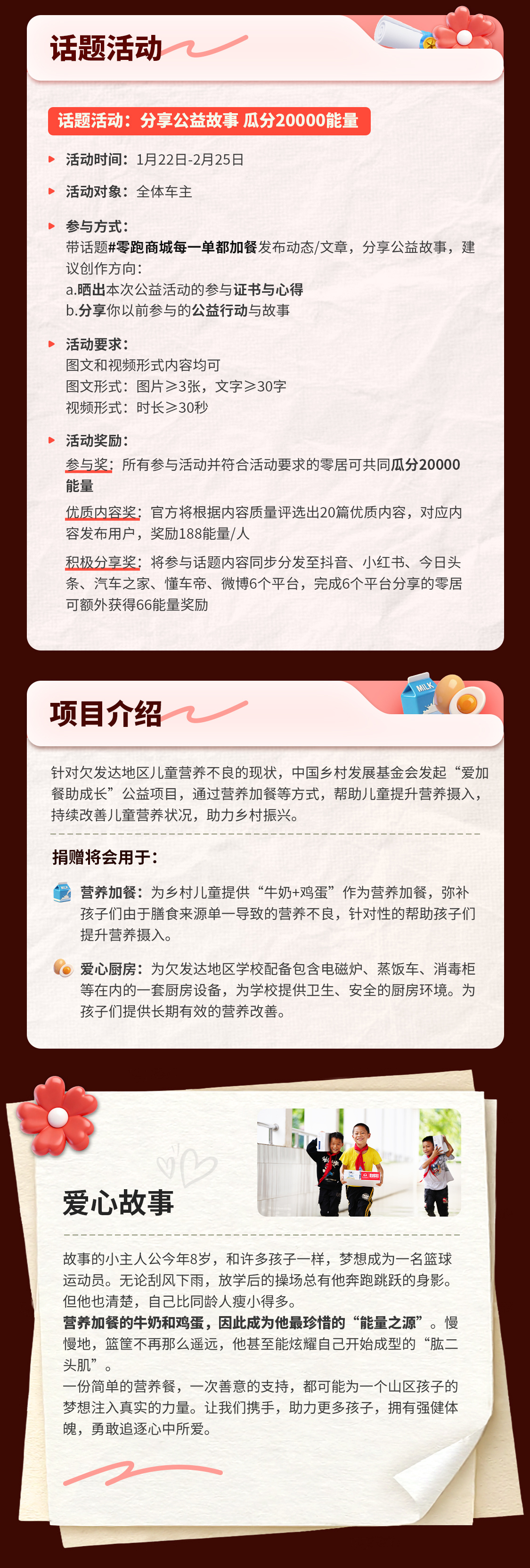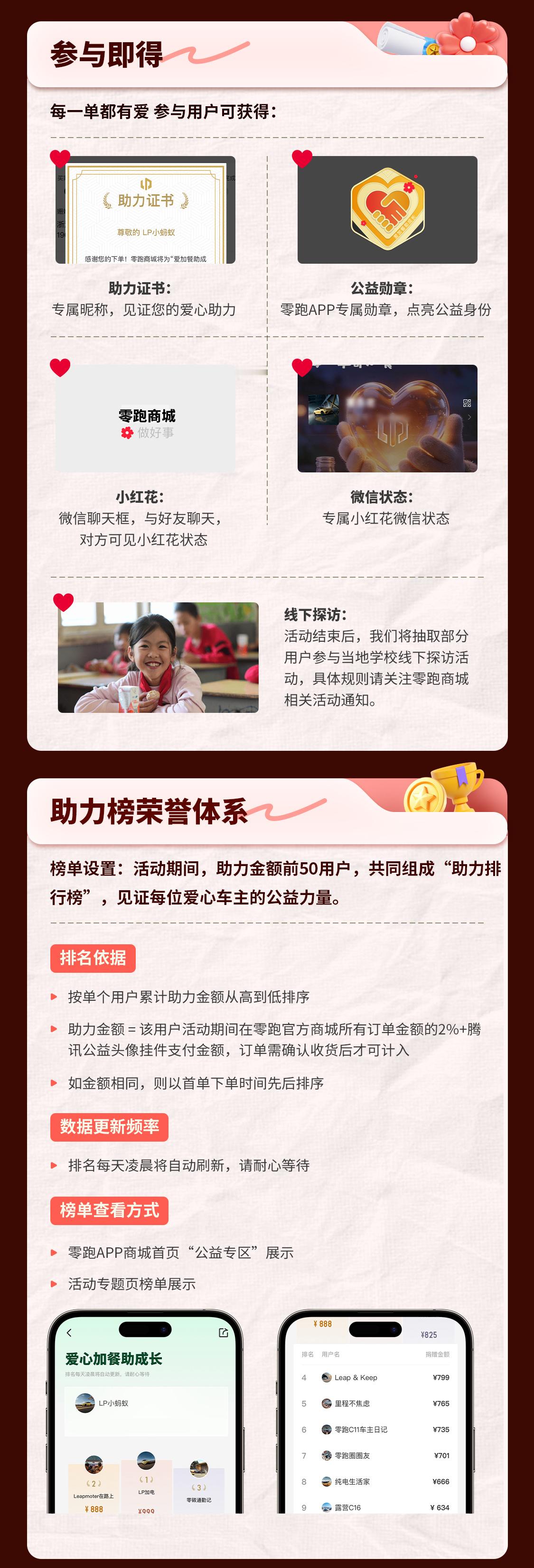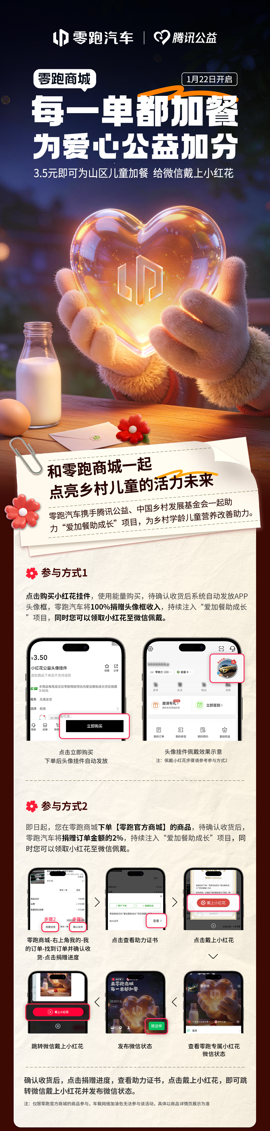 零跑汽车携手,邀您参与爱加餐助成长项目即日起在零跑官方商城下单,我们将捐赠订单金额的2%至公益项目点击链接,即刻参与:网页链接购买小红花公益头像挂件,我们将100%捐赠头像框收入点击链接,即刻参与:网页链接用你的每一单,助力乡村儿童营养改善💖参与即可领取助力证书、公益勋章、专属小红花标识等带话题 零跑商城每一单都加餐 在零跑APP分享你的公益行动还可参与瓜分20000能量,让爱心加倍传递更多活动详情,戳大图了解!为成长加餐,为未来助力零跑商城零跑汽车