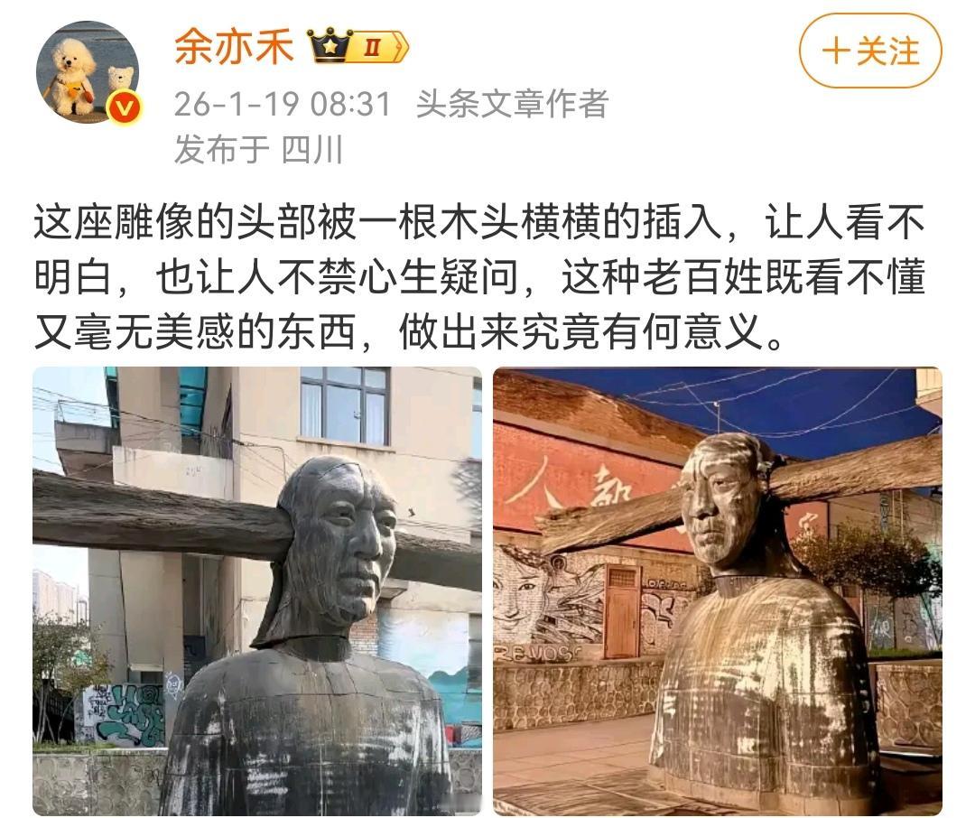 建筑是凝固的音乐?雷人的雕像? (如图所示)德国哲学家谢林和大诗人歌德都曾说过:“建筑是凝固的音乐”,确实,优美的建筑和雕像能让人赏心悦目。但国内某些艺术家偏偏反其道而行之,他们的作品以雷人为目的,比如这个一整根木头穿耳的雕像,是不是想要表达“如雷贯耳”的意思,真严重怀疑创作者的脑袋曾经进过水。