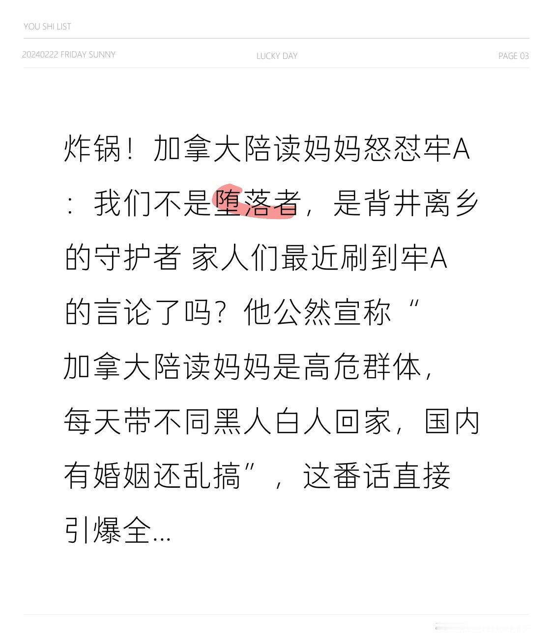 炸锅!加拿大陪读妈妈怒怼牢A:我们不是堕落者,是背井离乡的守护者 家人们最近刷到牢A的言论了吗?他公然宣称“加拿大陪读妈妈是高危群体,每天带不同黑人白人回家,国内有婚姻还乱搞”,这番话直接引爆全网,让无数陪读妈妈集体破防,也让这个特殊群体被推上风口浪尖! 就在大家争论不休时,一位在加拿大陪读5年的李姐站了出来,她的发声撕开了真相:“牢A说的根本不是多数人的生活,是把极端案例无限放大,我们的日子哪有那么潇洒,全是咬牙硬扛的牺牲!” 李姐的话引发上万陪读妈妈共鸣,有人晒出日常作息:早上6点起床做早餐,送孩子上学后跑移民局办续签,下午学英语、处理孩子学校事务,晚上还要远程帮国内公司处理工作,一天忙得脚不沾地。 可反转来了,也有匿名陪读妈妈坦言:“牢A说的情况确实存在,我身边就有姐妹换男友比换衣服勤,老公在国内赚钱,她在这边潇洒,互不干涉。” 两种截然不同的声音让事件更复杂,网友分成两派:一派骂牢A刻板印象污名化群体,一派说“没被戳中痛点的不会破防”。 但很少有人知道,陪读妈妈的困境背后,是加拿大政策的隐形枷锁。加拿大根本没有专门的“陪读签证”,家长只能办访问签证入境,每次最多待6个月,超时就得申请续签,而且全程不能合法工作。这意味着陪读妈妈要放弃国内事业,靠存款支撑自己和孩子的开销,多伦多、温哥华这样的大城市,一家三口一年花费至少50万人民币,经济压力大到喘不过气。 更煎熬的是精神孤独。语言不通的妈妈们很难融入当地社会,社交圈仅限于华人社群,孩子在全英文环境中快速成长,家长却原地踏步,慢慢形成“文化隔阂”,有些青春期孩子甚至觉得妈妈是“累赘”。而牢A口中的“钓鱼佬”确实存在,部分心怀不轨的人就是瞄准了妈妈们的孤独和无助,专门骗财骗色。 不过也有暖心的反转:加拿大陪读群体早已形成成熟的互助网络。李姐说,她们会互相分享租房信息、接送孩子搭伴、帮忙翻译英文文件,遇到签证难题还会集体找律师咨询。而且加拿大对低龄留学生的监护要求很严格,12岁以下孩子强制要求家长陪读,很多妈妈都是为了孩子能在人格养成关键期有人照顾,才毅然放弃国内一切。 其实这场争议的核心,从来不是“陪读妈妈好不好”,而是该不该用个别案例否定整个群体。就像渥太华陪读6年的张姐说的:“我们中有坚守底线的守护者,也有迷失自我的人,但不能一棍子打死。背井离乡不是为了放纵,是想给孩子更好的教育,这份牺牲不该被污名化。” 每个陪读家庭都有自己的选择和无奈,加拿大没有完美的乌托邦,陪读生活也不是非黑即白。我们该看到的,是父母对孩子的拳拳爱意,是异乡生存的不易,而不是被极端言论带偏,给某个群体贴标签。 你觉得牢A的言论是真相还是偏见?如果是你,会为了孩子选择陪读吗?评论区聊聊你的看法,别忘了点赞转发,让更多人了解陪读妈妈的真实生活:她们不是堕落者,只是一群背井离乡的守护者!