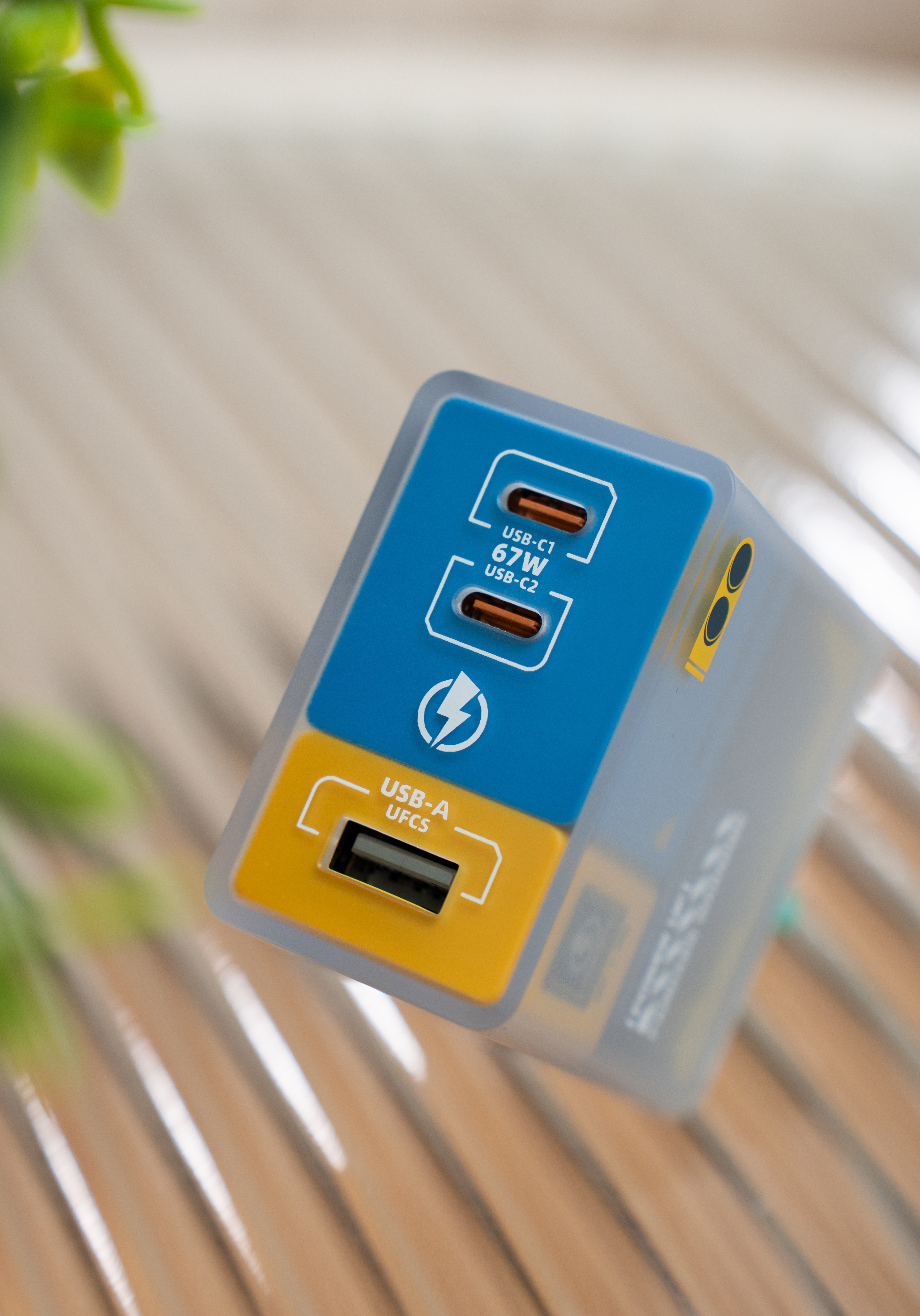 质感好物分享|67W GaN电源适配器有点东西 魅族PANDAER和领克联合设计采用有高级感的蓝黄撞色模块化设计,经典就在于颜值相当高~当然,半透明磨砂的外壳,舒适很手感,可折叠的插脚设计,携带也很方便!作为三接口氮化镓适配器,功能方面,不仅支持多种快充协议,而且单口最高支持67W输出,笔记本电脑和手机、耳机同时补能也互不干扰。高颜值有实力的数码好物,让充电这件小事变得充满仪式感,谁又能拒绝呢?