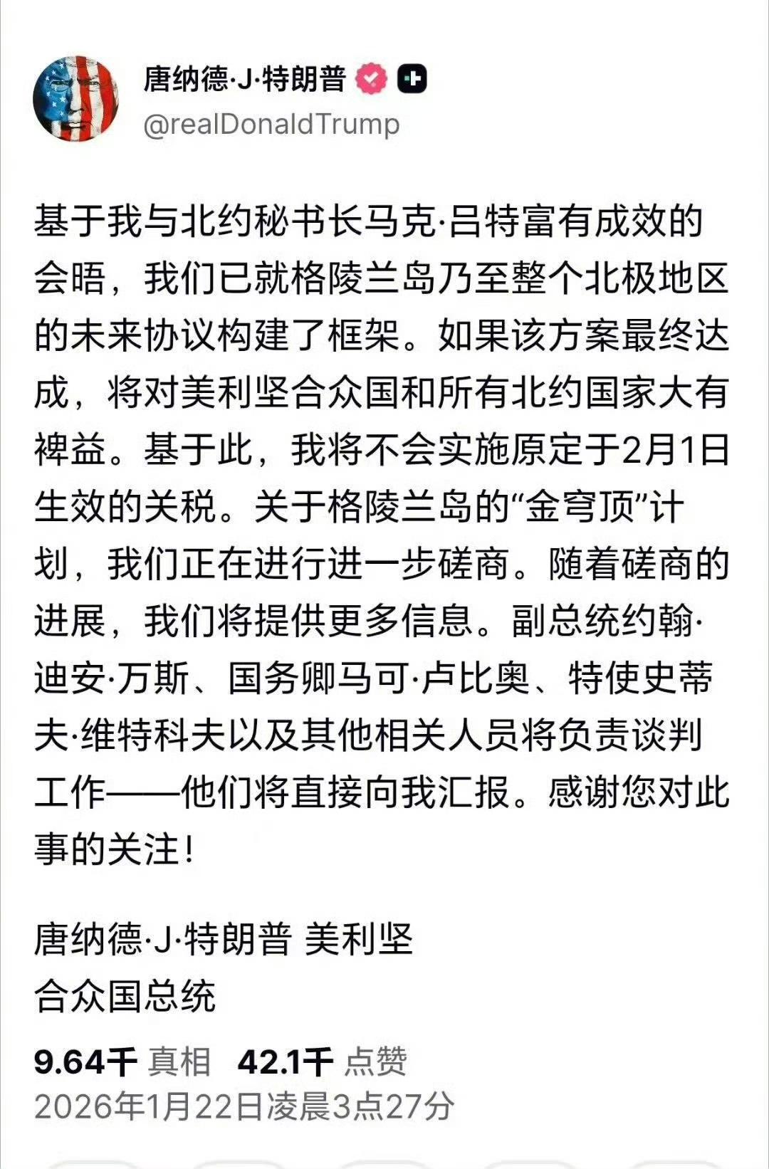 特朗普认怂了!承诺排除武力夺取格陵兰岛,2月1落地的关税大棒也取消了!欧洲终于可以松一口气了。 达沃斯1月21日,特朗普公开承诺排除武力夺取格陵兰岛,称“不必、不愿、不会动武",但仍坚持“立即谈判收购”。 与北约秘书长吕特达成格陵兰、北极协议框架,随即取消2月1日对欧洲8国10%惩罚性关税。 美方目标不变,强化北极军事存在、控制稀土等矿广产、遏制俄中北极影响。 后续副总统万斯、国务卿鲁比奥牵头, 推进基地扩容、矿产合作、反导部署等"非主权收购”方案。 丹麦与格陵兰态度主权红线不退,警惕“切香肠”式蚕食。 欧洲只是暂时避险,并非危机终结。特朗普的让步是战术调整,美国对格陵兰的核心诉求(安全+资源)未变,跨大西洋博弈将转向更隐蔽的谈判桌。