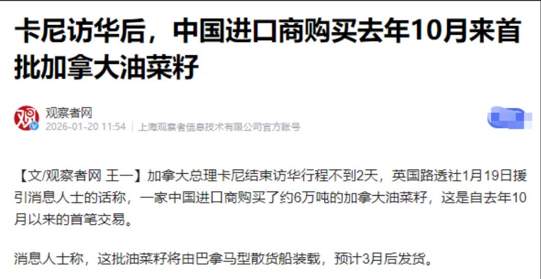 澳大利亚天塌了,在加拿大总理卡尼上周访华之后,一家中国进口商购买了一批加拿大油菜籽,多达 6 万吨,这极大提振了加拿大农民的前景。不过对于澳大利亚来说,这简直就是一个噩耗,因为加拿大抢走了本该属于他们的订单,这也让澳大利亚民众十分失望。 中国买家突然下单6万吨加拿大油菜籽,这事搁澳大利亚眼里,不亚于自家粮仓被掏了底。 要知道,去年加拿大跟着美国对中国电动车加征100%关税时,中国反手把油菜籽综合税率飙到84%,直接让加拿大货进不了港。 那半年里,加拿大西部粮仓堆了1900万吨油菜籽,农民急得连粮仓自燃的新闻都上了头条。 谁都以为澳大利亚能趁机顶上——毕竟中国每年六百多万吨的需求缺口,够澳洲吃好几年。 可现在加拿大总理卡尼访华三天,关税砍到15%,首单6万吨直接签了,澳大利亚人傻眼了:煮熟的鸭子咋飞了? 加拿大萨斯喀彻温省的黑土地,天生适合种高含油量的油菜籽,中国油厂用习惯了,从港口到榨油厂的物流链都是现成的。 澳大利亚虽说2025年底恢复了对华出口,第一船6万吨刚到青岛,可他们的产量太不争气。 2025年澳洲油菜籽收成只有570万吨,五年来最低,其中400万吨早被欧洲老客户订走了。 中国就算敞开买,澳洲现货也就百把万吨,还得看老天爷脸色——今年旱情刚缓解,明年说不定又涝了。 加拿大不一样,每年稳定产1800万吨,光萨斯喀彻温省就能甩澳洲全省两倍的量,船期排得满满当当,价格还能压澳洲5%。 更狠的是中加的“交换协议”。加拿大给中国4.9万辆电动车的低关税配额,税率从100%跌到6.1%,中国则把油菜籽关税砍到15%。 这招对澳大利亚来说是降维打击:人家用电动车换粮食,澳大利亚拿什么换?跟着AUKUS搞核潜艇合作,结果中美贸易战一来,自己卡在中间动弹不得。 去年中国恢复澳油菜籽进口时,澳洲农民还没来得及庆祝,加拿大已经带着省长进京谈长期协议了。政策反应慢半拍,直接导致澳洲在2026年开春的抢单大战中彻底掉队。 澳大利亚的尴尬还在于“临时替补”的宿命。加拿大被关税卡住时,中国确实买了50万吨澳洲货,但那是应急。 郑州期货市场的菜粕价格,在加拿大关税松绑当天直接跌了2.4%,说明市场早就算明白账:加拿大恢复供应后,澳洲货的溢价空间没了。 中国油厂算过账,加拿大油菜籽到港价每吨比澳洲便宜80块,一个6万吨的单子就能省480万,够买一船蒙古煤了。 澳洲农民抱怨“中国不念旧情”,可生意人算的是成本——加拿大的供应链像自来水,拧开就有;澳洲的供应像井水,旱了就没。 更深层的问题在澳洲的经济结构。这个靠卖资源起家的国家,农产品出口有个致命弱点:可替代性太强。中国从俄罗斯买油菜籽,从印度买菜粕,甚至在内蒙古推广高油油菜品种(含油率65%,比加拿大还高2个点)。 澳洲除了铁矿石,其他农产品在全球市场都是“有也行,没有也行”的角色。 2025年他们趁着加拿大断供捡了个漏,结果发现自己根本接不住长期订单——全国油菜籽仓储能力只有300万吨,赶上丰收年就得露天堆,品质还容易出问题。 政治站队的代价也开始反噬。澳大利亚跟着美国搞AUKUS,军舰越造越贵,农业补贴却越砍越少。加拿大总理卡尼访华时,直接带着农业大省省长谈生意,澳洲这边还在为核潜艇预算吵得不可开交。 中国商务部的人私下说:“加拿大知道我们要电动车市场,澳洲只知道跟着美国喊口号。”这种务实差距,让澳洲在关键谈判中毫无筹码——人家用市场换技术,澳洲只能用情怀换订单,结果情怀在商海里根本不值钱。 现在最难受的是澳洲农民。去年刚借钱扩种油菜,盼着中国订单续命,结果加拿大突然“复活”。 昆士兰州的农场主汤姆算过账:他去年囤的5000吨油菜籽,原本指望卖中国赚20%,现在加拿大货一来,每吨要亏50澳元。 更惨的是仓储费——澳洲内陆粮仓紧缺,露天堆的菜籽发霉率高达8%,而加拿大的粮仓直接连到港口,火车皮随到随装。这种产业链的差距,不是靠临时降价能补上的。 中国的算盘其实很清楚:多元化供应链,谁便宜稳定就买谁。加拿大恢复供应,不代表抛弃澳洲,但澳洲自己把路走窄了。 2025年他们出口中国的50万吨油菜籽,不到加拿大巅峰期的十分之一,现在人家一个月就能补上。 更关键的是,中国国产油菜籽产量每年涨5%,2026年预计突破1500万吨,对外依存度从90%降到60%。澳洲再不清醒,以后连“替补”的位置都保不住。 这场菜籽之争,说到底是实力的较量。更是全球农产品贸易的新规则:没有永远的盟友,只有算得清的账本。澳大利亚要是还抱着“资源为王”的老黄历,未来怕是连哭的地方都找不到。