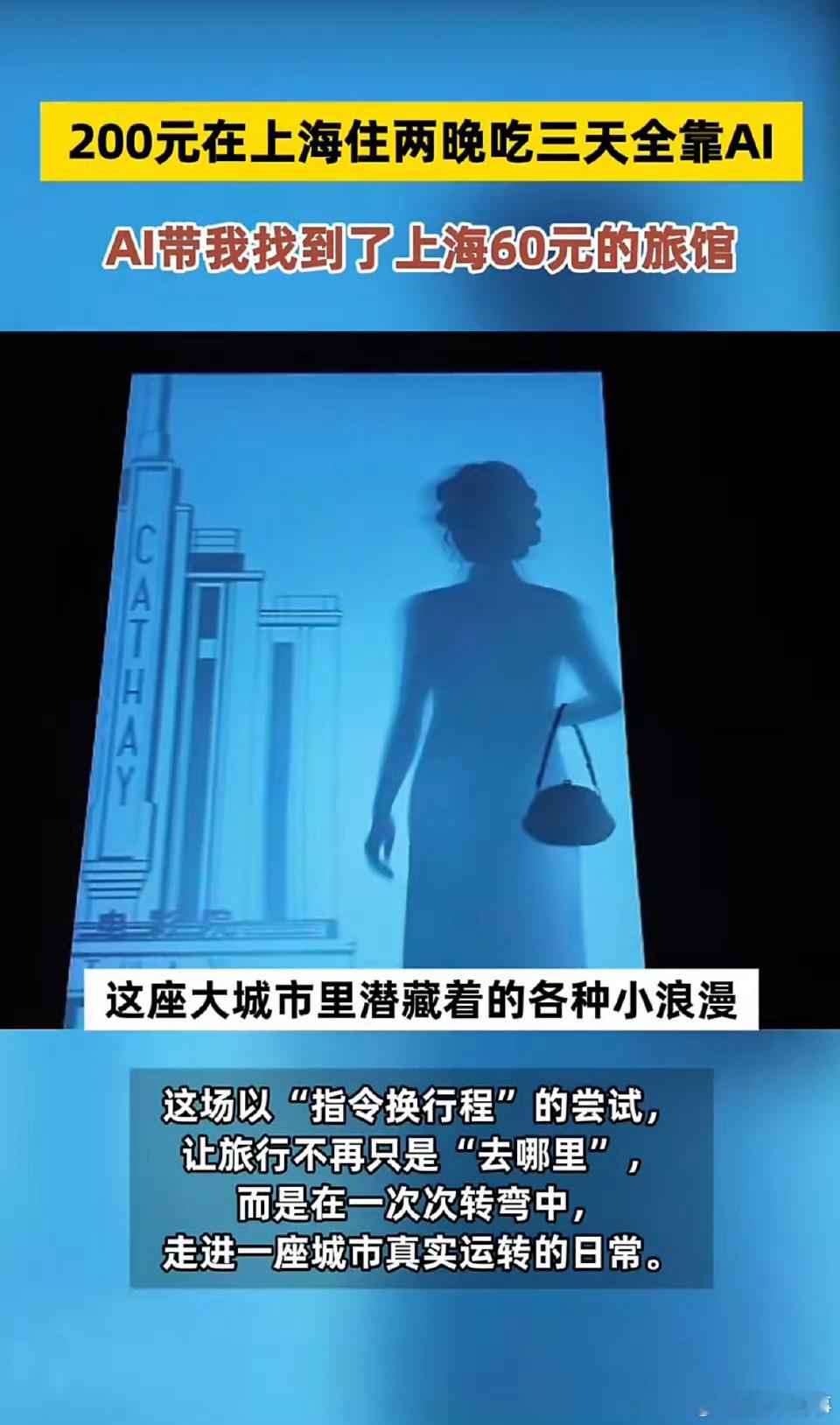 200元在上海住两晚吃三天全靠AI 原来旅行还可以这样——不是追逐攻略上的热门打卡,而是跟着AI钻进弄堂食堂,住进几十块的床位,用公交和双脚丈量街道。它让我看见的,不只是外滩的灯,还有城市皱褶里,那些安静而扎实的生活痕迹。旅行本该是去遇见,而不只是到达。AI带我找到了上海60元的旅馆
