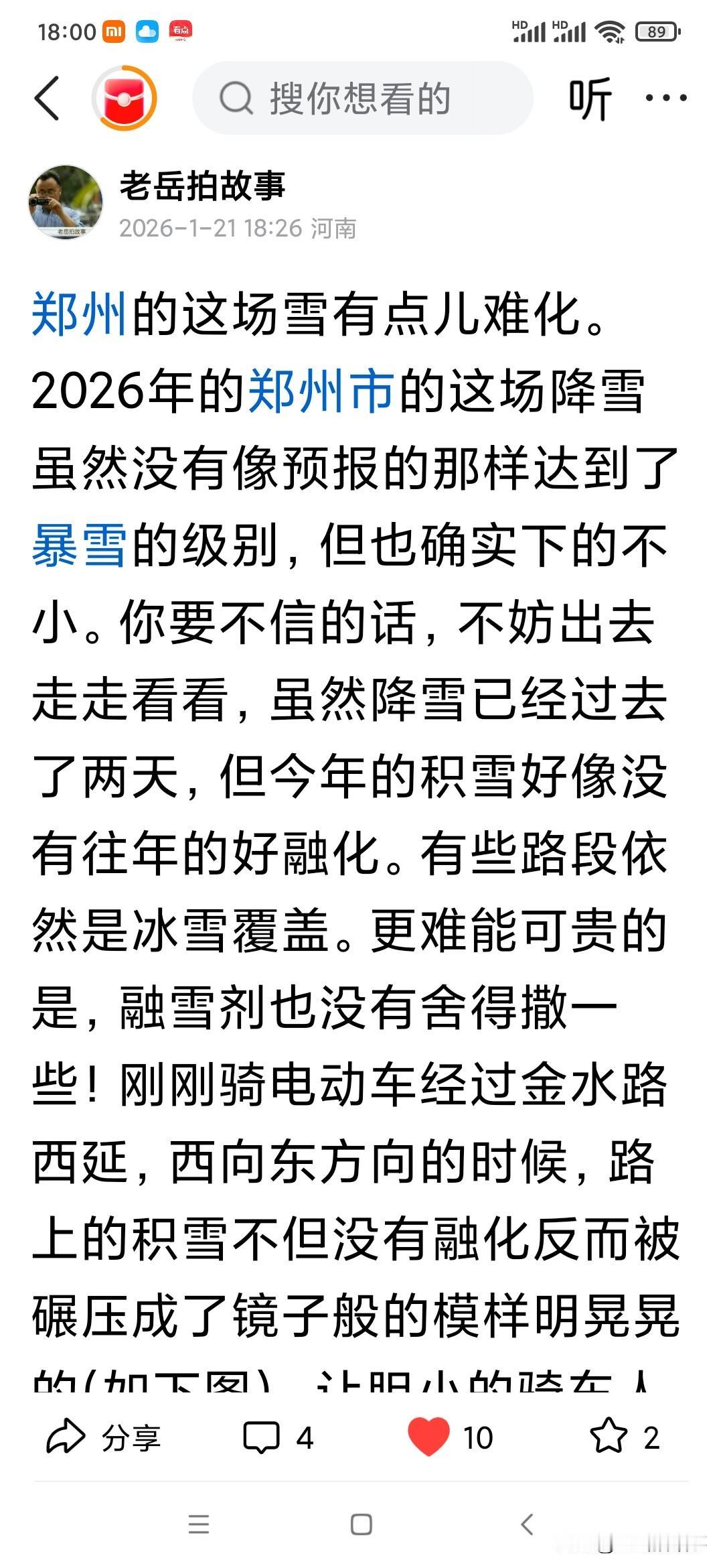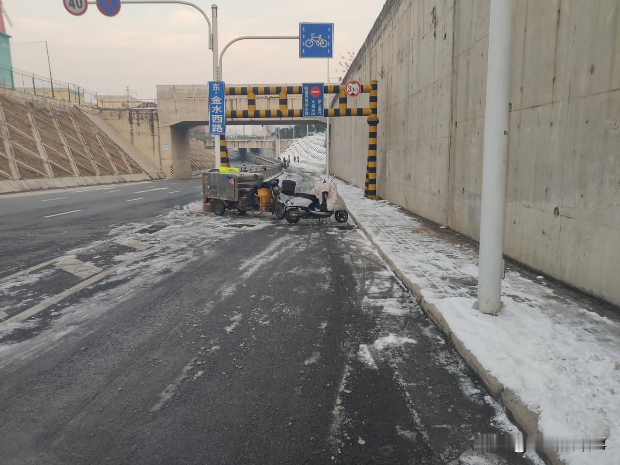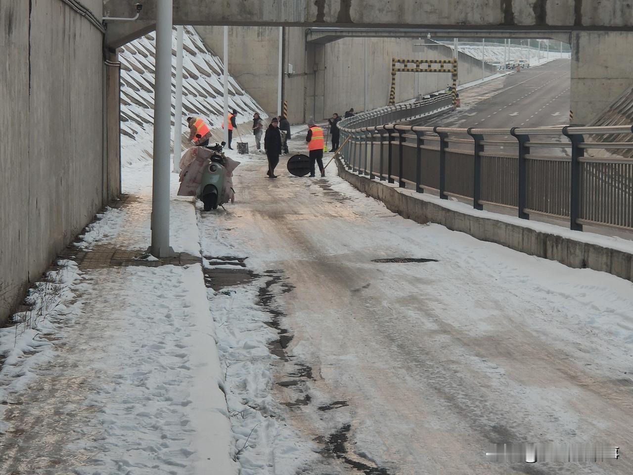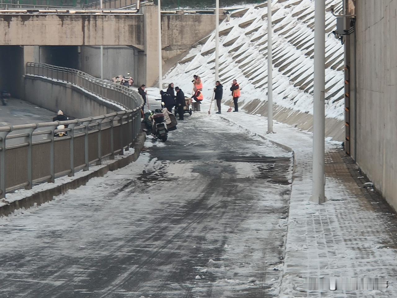 头条影响力:昨天(2026年1月21日)本人在头条上写了关于郑州市金水区金水西路西延路上,西向东方向,有一处路面积雪无人处理的事情后,在网上引起网民们的极大关注。今天下午五点三十分左右,本人再次来到该路段进行现场查看时,发现已经有多名身穿橘黄色环卫服的环卫工在现场将西边路口用车辆封堵后(如图),用工具清理路面积雪和结冰。由于这段路上积雪没能得到及时清理,被过往电动车反复碾压后,已经变的十分坚硬和光滑,现场看到环卫工只能用铁锹一下一下的向下砸磕路面积雪和结冰,站在远处便能听到咔!咔!的铁锹撞击路面积雪和结冰的声音。就在本人现场拍照的时候,一骑电动车从西边过来途经这里的市民看到有人在处理这段路面积雪后,自言自语的说道:“可有人过来铲雪了!要是早点儿铲,也不会摔昨天那一跤!”经了解得知该路人家住大石桥妇幼保健院附近,在位于中原区的一家公司上班,自金水西路西延部分开通后,极大的方便了他上下班,他几乎每天都要从这里经过。这场大雪过后,他再从这里骑车经过的时候,发现就这一段路上的积雪没人处理,他昨天下午经过这里的时候车下一滑摔了一跤:“脚脖到现在还疼着呢!现在终于有人过来处理了!”