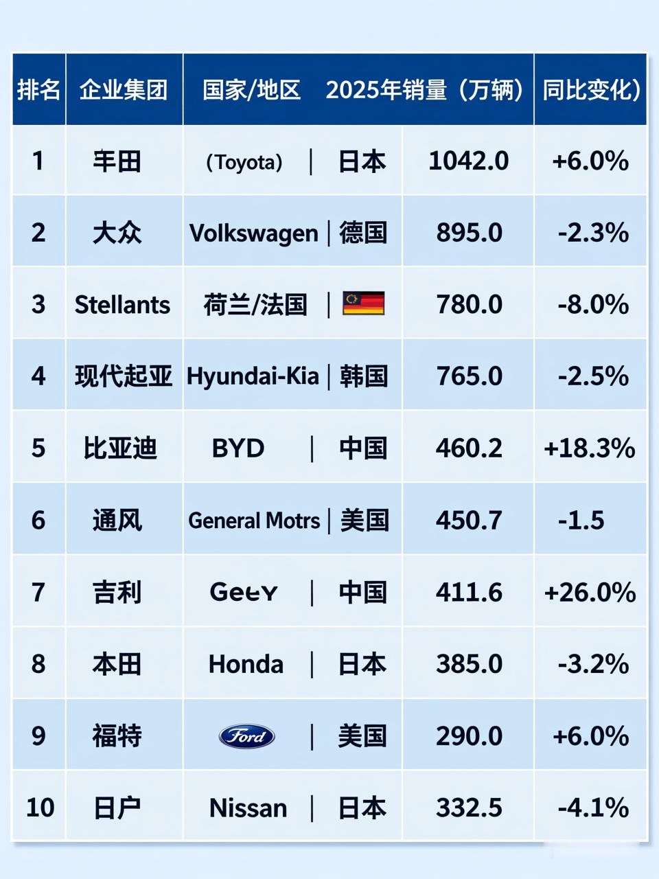 吉利控股目标2030年跻身全球前五吉利的目标销量是,2030年达到650万辆,营收1万亿。2025年吉利销量441万辆,已经是全球第七了,感觉这“五年计划”也不是特别激进,算是挺务实的目标。目前,2025年全球车企销量排名在图二,啥时候国内车企能荣登前三啊~