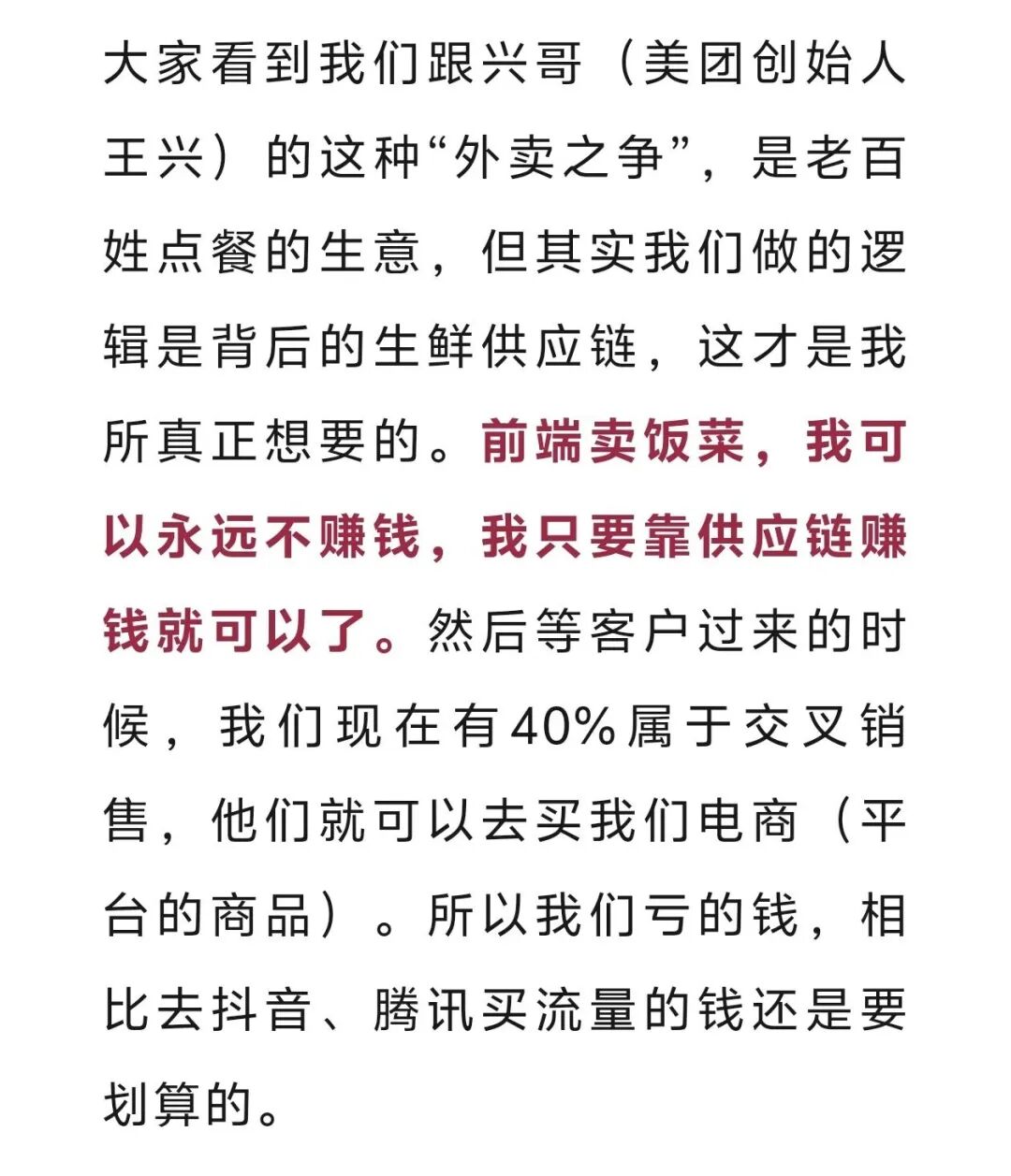 刘强东曾表示,“我们现在有40%属于交叉销售,他们就可以去买我们电商(平台的商品)。所以我们亏的钱,相比去抖音、腾讯买流量的钱还是要划算的。”