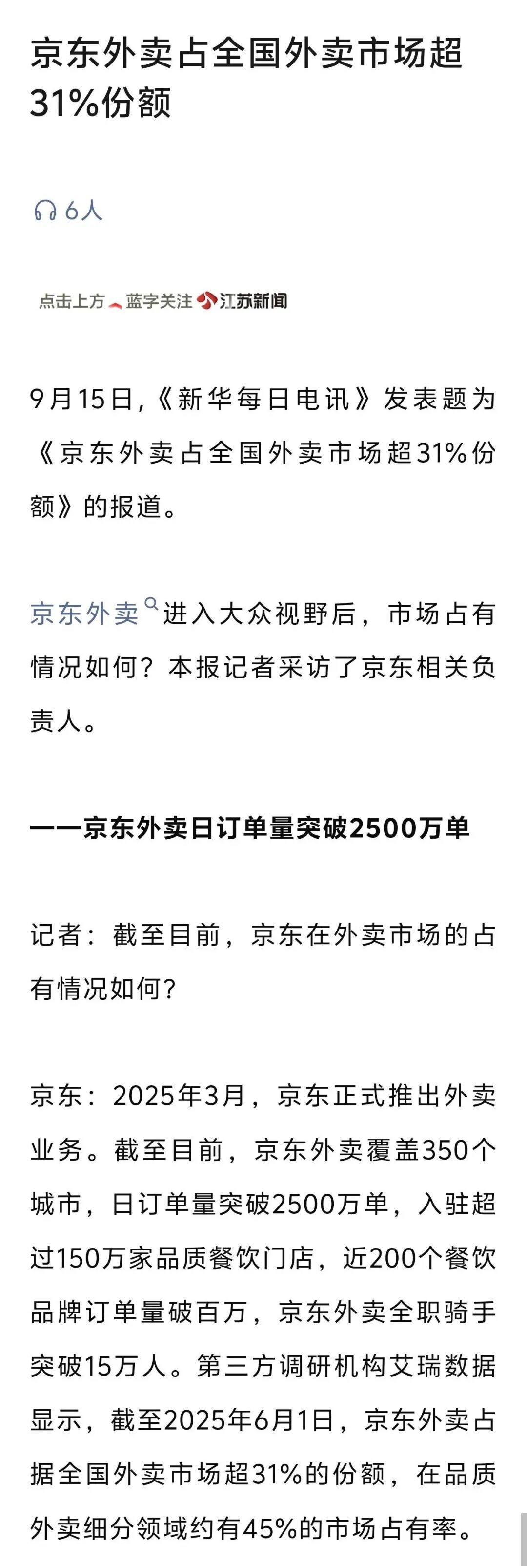 京东相关负责人透露,截至2025年9月,京东外卖已覆盖全国350个城市,入驻餐饮门店超150万家,日订单量突破2500万单。