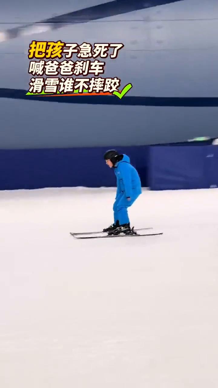 把孩子急死了,喊爸爸刹车。 滑雪谁不摔跤。